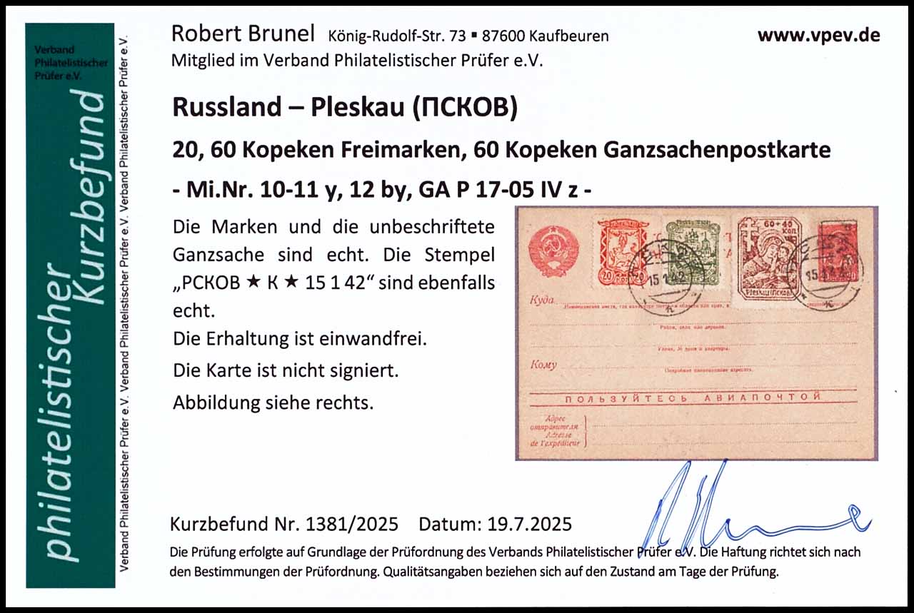 20 Kopeken eingeschriebene Ganzsachenpostkarte mit Aufdruck "Pleskau/60 kop", mit Werbespruch 05, schwarzer Handstempelaufdruck, Blankokarte, mit Zusatzfrankatur, Pleskau MiNr. 10-11y und MiNr. 12by, entwertet "PCKOB * K * 15 1 42", tadellose Erhaltung, Fotobefund Robert Brunel VP (2025) "Die Erhaltung ist einwandfrei."