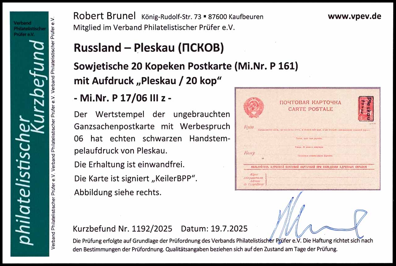 20 Kopeken Ganzsachenpostkarte mit Aufdruck "Pleskau/20 kop", mit Werbespruch 06, schwarzer Handstempelaufdruck, ungebraucht, tadellose Erhaltung, geprüft Keiler BPP, Fotobefund Robert Brunel VP (2025), "Die Erhaltung ist einwandfrei"