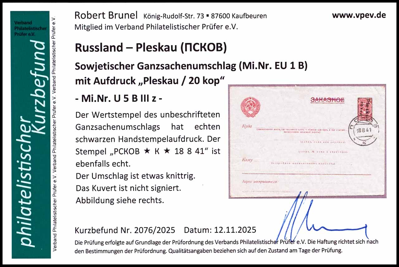 60 Kopeken Ganzsachenumschlag mit schwarzem Aufdruck " Pleskau 20 kop", entwertet mit Stempel "PCKOB * K * 18 8 41", Umschlag etwas knittrig, Fotobefund Robert Brunel VP (2025)