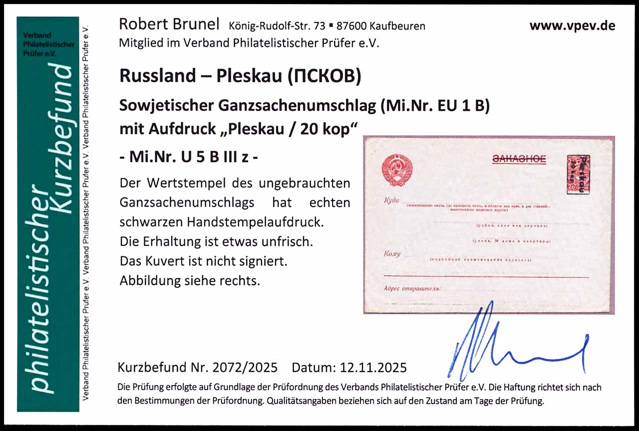 60 Kopeken Ganzsachenumschlag mit schwarzem Aufdruck " Pleskau 20 kop", ungebraucht, tadellos, geprüft Dr. Schultz, Fotobefund Robert Brunel VP (2025) "Die Erhaltung ist einwandfrei"