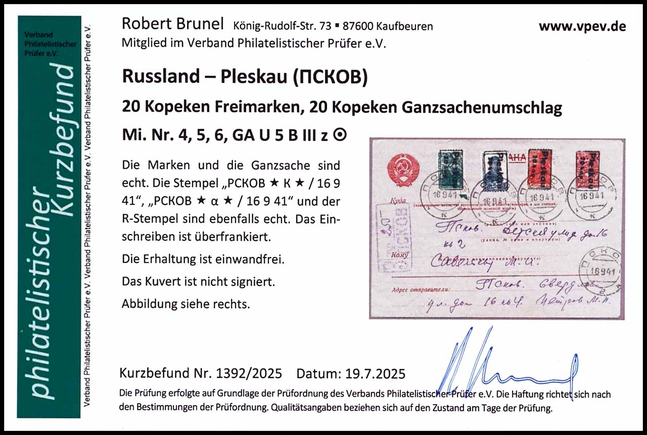 60 Kopeken eingeschriebener Ganzsachenumschlag mit Aufdruck "Pleskau/ 20 kop", schwarzer Handstempelaufdruck, mit Zusatzfrankatur Pleskau MiNr. 4-6, entwertet mit Stempel "PCKOB * K * 16 9 41" und "PCKOB * a * 16 9 41", der Ganzsachenumschlag ist überfrankiert, tadellose Erhaltung, Fotobefund Robert Brunel VP (2025) "Die Erhaltung ist einwandfrei"