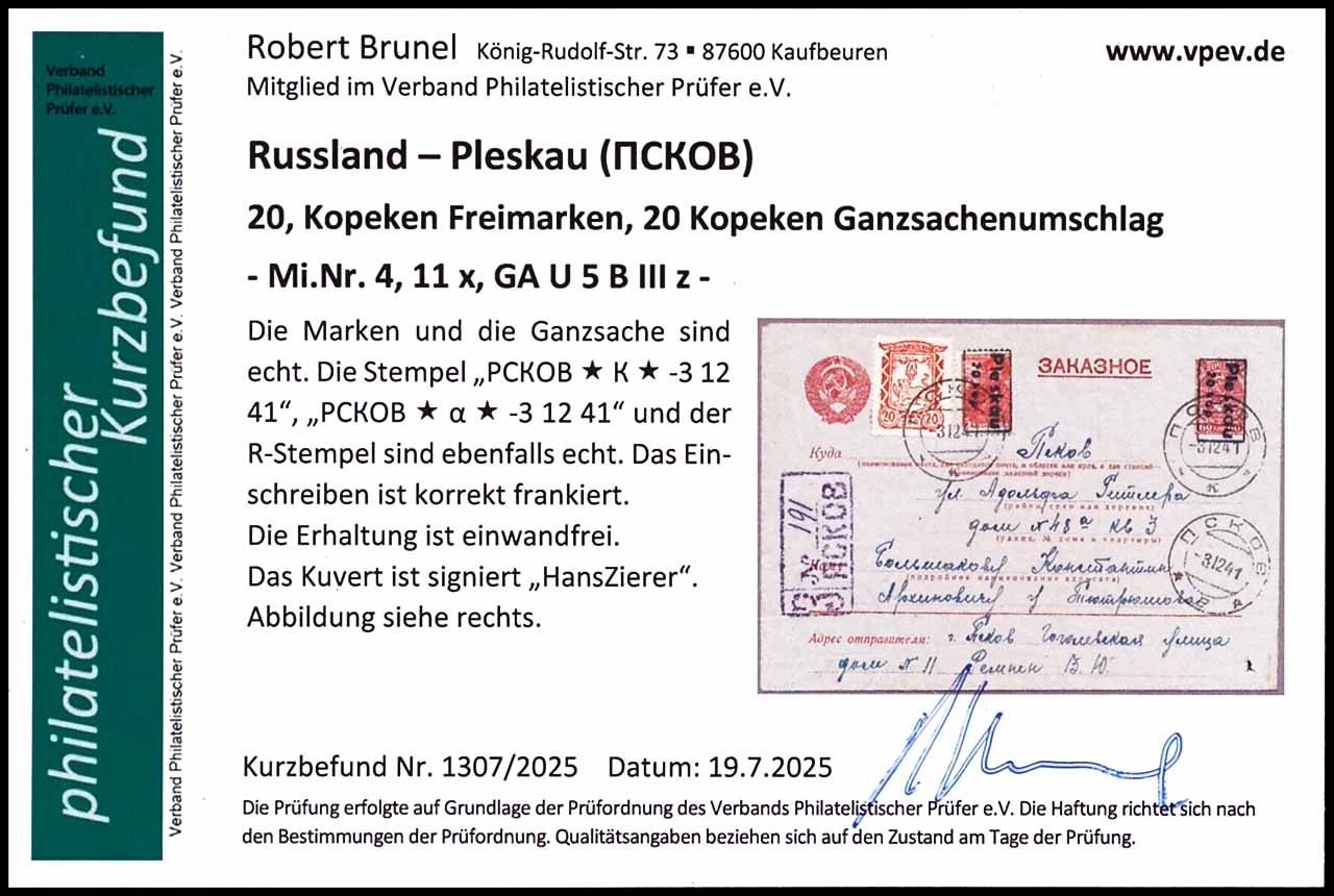 60 Kopeken eingeschriebener Ganzsachenumschlag mit Aufdruck "Pleskau/ 20 kop", schwarzer Handstempelaufdruck, mit Zusatzfrankatur Pleskau MiNr. 4 und 11x, entwertet mit Stempel "PCKOB * K * 3 12 41" und "PCKOB * a * 3 12 41", der eingeschriebene Ganzsachenumschlag ist korrekt frankiert, tadellose Erhaltung, geprüft Hans Zierer, Fotobefund Robert Brunel VP (2025) "Die Erhaltung ist einwandfrei"