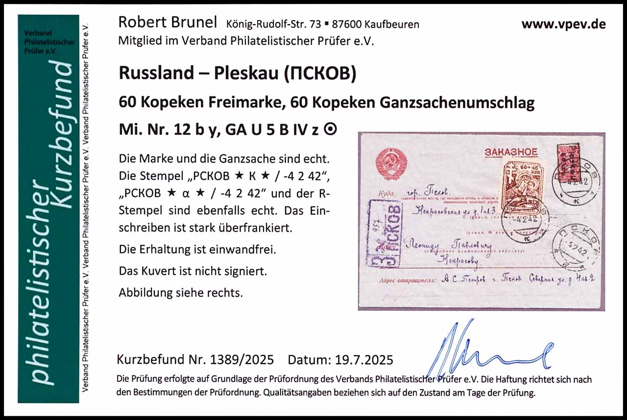 60 Kopeken eingeschriebener Ganzsachenumschlag mit Aufdruck "Pleskau/ 60 kop", schwarzer Handstempelaufdruck, mit Zusatzfrankatur Pleskau MiNr. 12by, entwertet mit Stempel "PCKOB * K * -4 2 42" und "PCKOB * a * -4 2 42", der Ganzsachenumschlag ist überfrankiert, tadellose Erhaltung, Fotobefund Robert Brunel VP (2025) "Die Erhaltung ist einwandfrei"