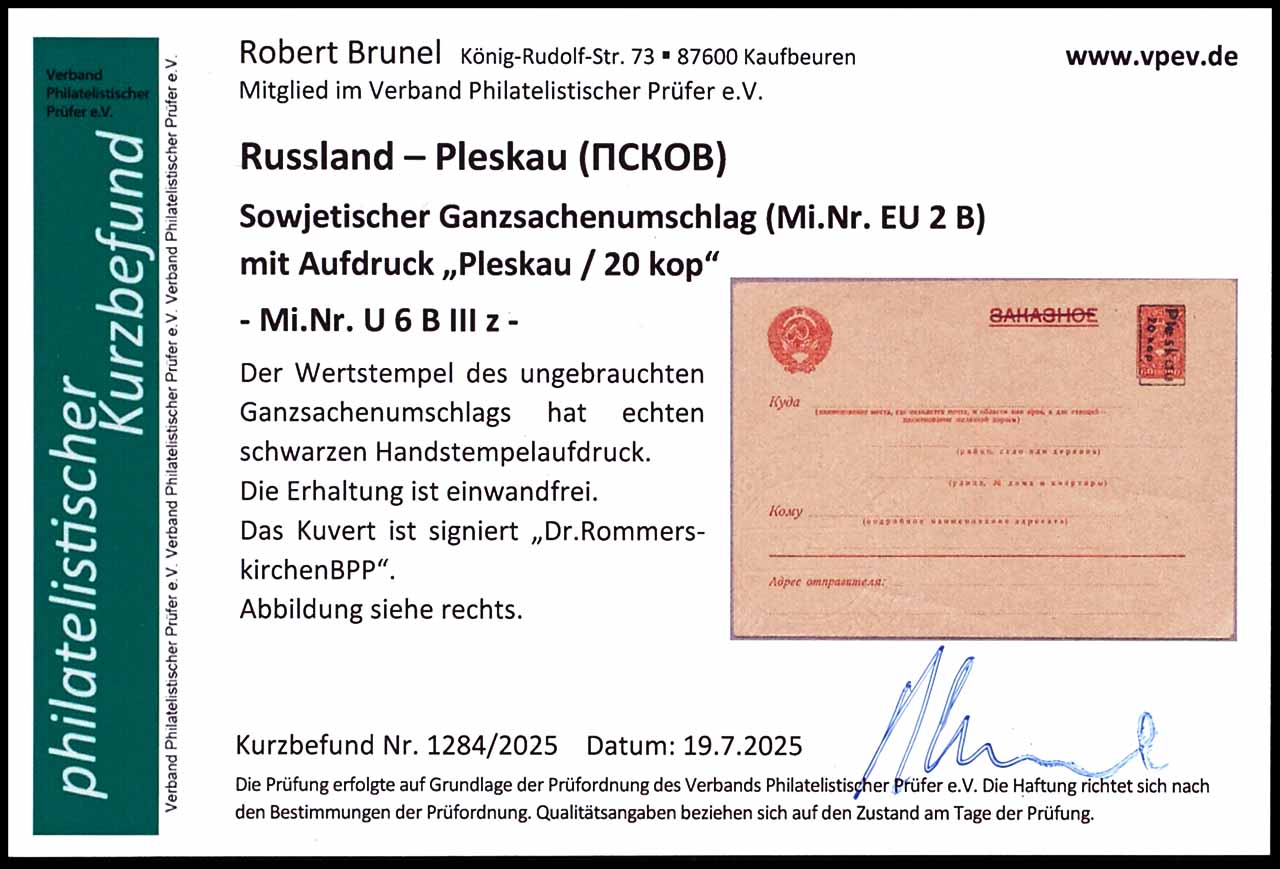 60 Kopeken Ganzsachenumschlag mit Aufdruck "Pleskau/ 20 kop", schwarzer Handstempelaufdruck, ungebraucht, tadellose Erhaltung, Fotobefund Robert Brunel VP (2025) "Die Erhaltung ist einwandfrei", geprüft Dr. Rommerskirchen BPP