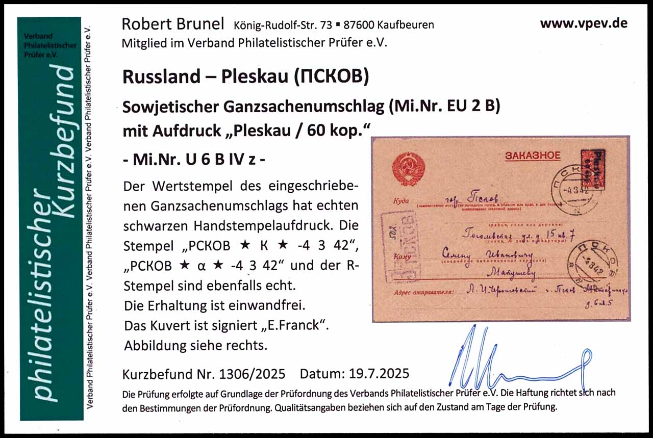 60 Kopeken Ganzsachenumschlag mit Aufdruck "Pleskau/ 60 kop", schwarzer Handstempelaufdruck, adressiert, entwertet mit "PCKOB * K * -4 3 42" und "PCKOB * a * -4 3 42" und R-Stempel, alle echt, tadellose Erhaltung, Fotobefund Robert Brunel VP (2025) "Die Erhaltung ist einwandfrei", geprüft E. Franck