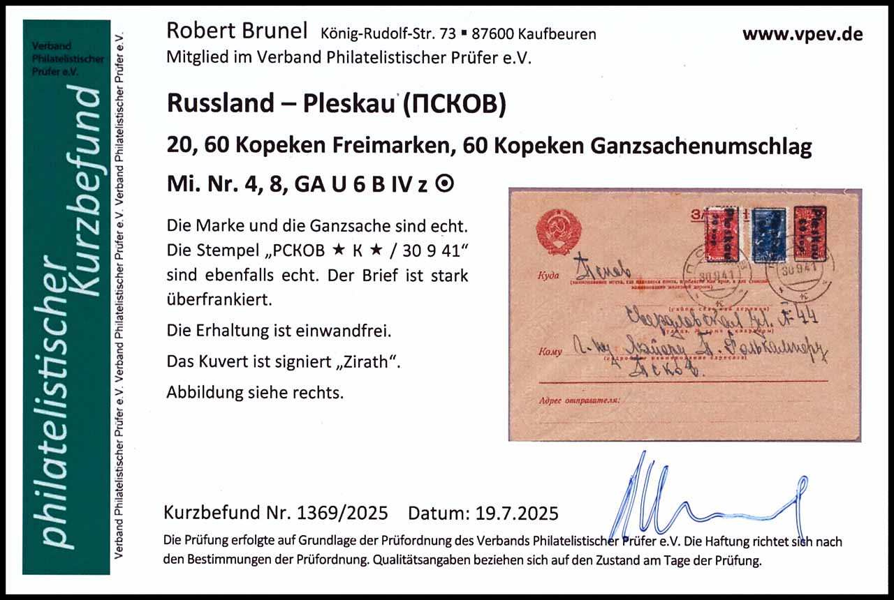 60 Kopeken Ganzsachenumschlag mit Aufdruck "Pleskau/ 60 kop", schwarzer Handstempelaufdruck, mit Zusatzfrankatur Pleskau MiNr. 4 und 8, entwertet mit Stempel "PCKOB * K * 30 9 41", tadellose Erhaltung, stark überfrankiert, Fotobefund Robert Brunel VP (2025) "Die Erhaltung ist einwandfrei"