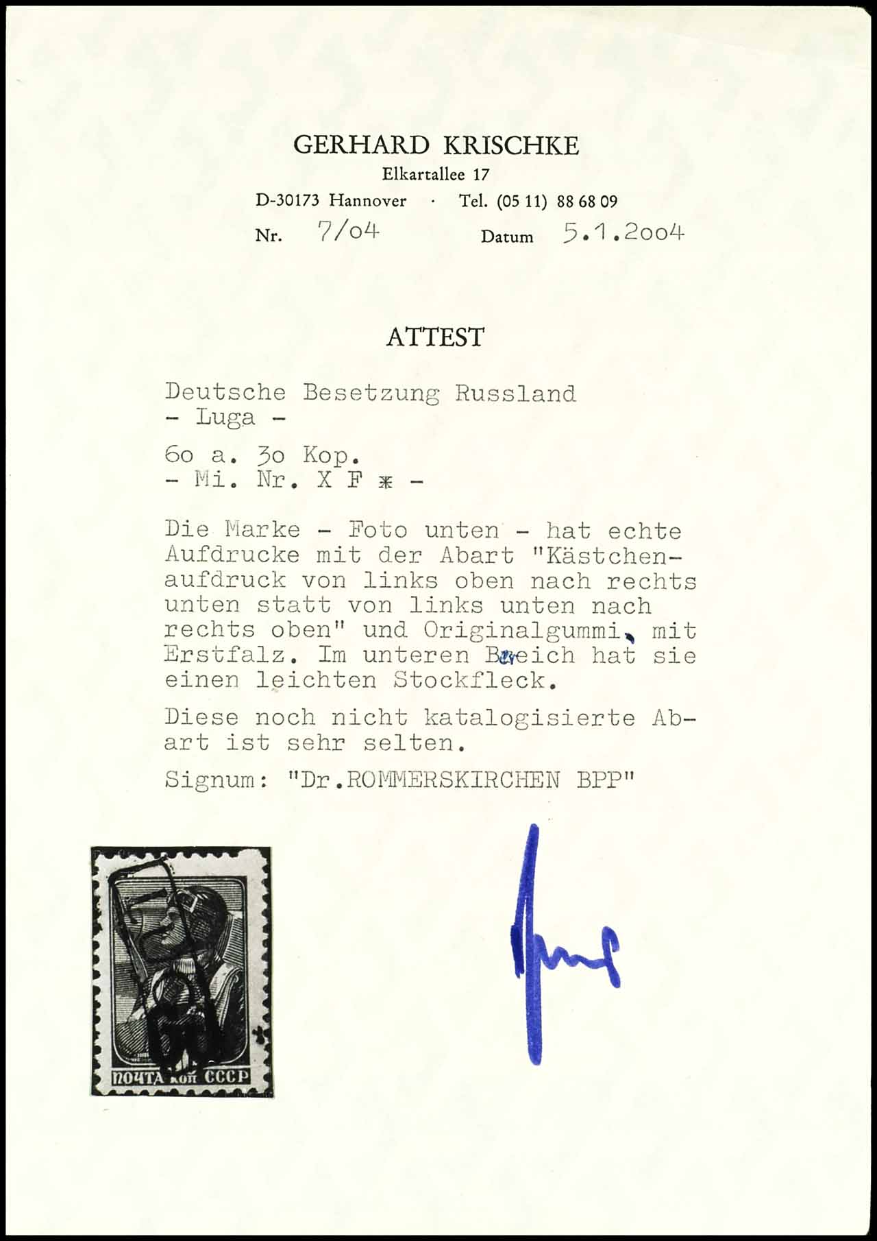 Nicht ausgegeben: 60 auf 30 Kopeken Werktätige, Abart "Kästchenaufdruck von links unten nach rechts oben", ungebraucht mit Originalgummierung, rückseitig im unteren Bereich ein leichter Stockfleck, ansonsten tadellose Erhaltung, sehr selten, signiert Dr. Rommerskirchen und Fotoattest Gerhard Krischke "Abart ist sehr selten.", Mi. 900.- (unterbewertet)