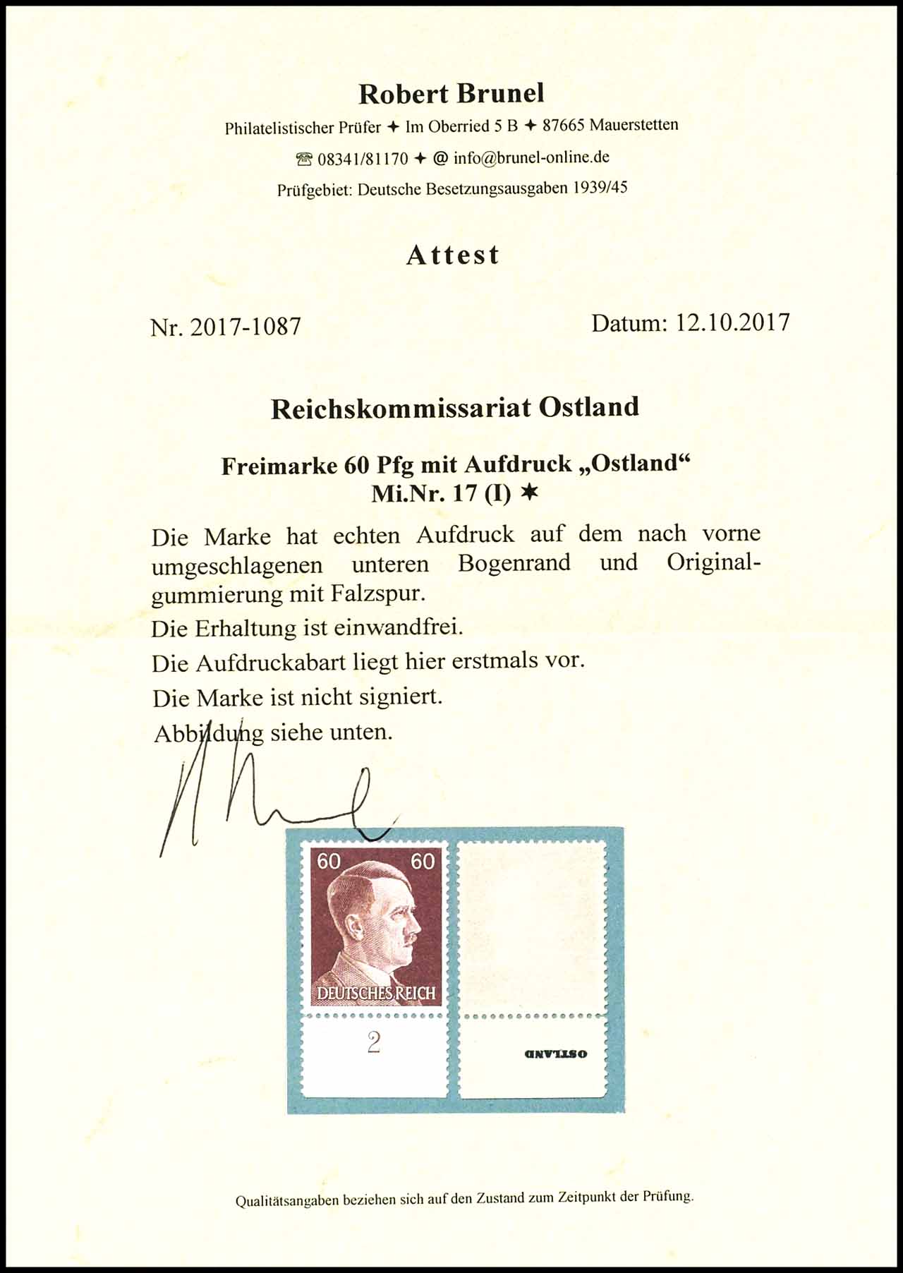 60 Pfennig Hitler, Unterrandstück mit Aufdruck "Ukraine" auf dem umgeschlagenen Bogenrand (gummiseitig), Marke daher ohne Aufdruck, ungebraucht mit Originalgummierung, tadellose Erhaltung, Attest Robert Brunel "Die Erhaltung ist einwandfrei."