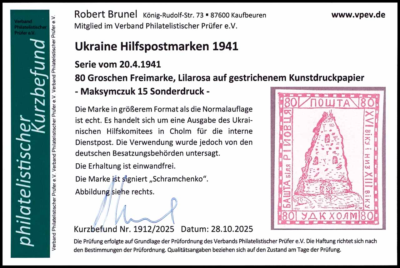 Hilfspost Ukraine Cholm Ausgabe 20.4.1941, 80 Groschen Lilarosa auf ungummiertem, gestrichenem Kunstdruckpapier, Ausgabe des Ukrainischen Hilfskomitees in Cholm für die interne Dienstpost - dessen Verwendung aber von den deutschen Besatzungsbehörden untersagt wurde, ungebraucht - wie verausgabt, tadellos, geprüft Shramchenko, Fotobefund Robert Brunel VP (2025) "einwandfrei", selten angeboten!