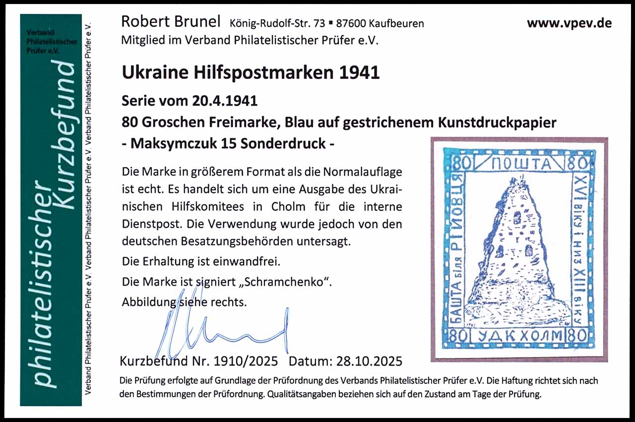 Hilfspost Ukraine Cholm Ausgabe 20.4.1941, 80 Groschen blau auf ungummiertem, gestrichenem Kunstdruckpapier, Ausgabe des Ukrainischen Hilfskomitees in Cholm für die interne Dienstpost - dessen Verwendung aber von den deutschen Besatzungsbehörden untersagt wurde, ungebraucht - wie verausgabt, tadellos, geprüft Shramchenko, Fotobefund Robert Brunel VP (2025) "einwandfrei", selten angeboten!