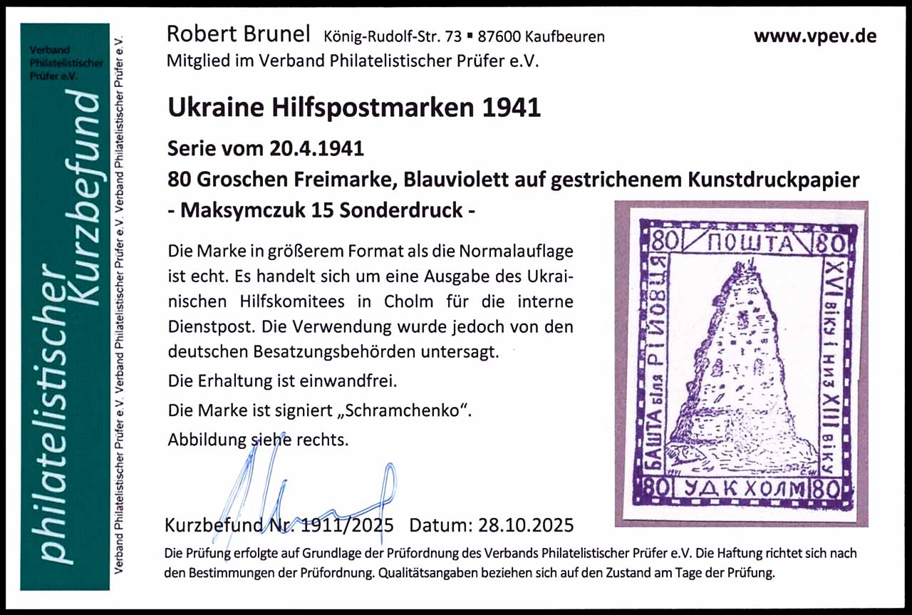 Hilfspost Ukraine Cholm Ausgabe 20.4.1941, 80 Groschen blauviolett auf ungummiertem, gestrichenem Kunstdruckpapier, Ausgabe des Ukrainischen Hilfskomitees in Cholm für die interne Dienstpost - dessen Verwendung aber von den deutschen Besatzungsbehörden untersagt wurde, ungebraucht - wie verausgabt, tadellos, geprüft Shramchenko, Fotobefund Robert Brunel VP (2025) "einwandfrei", selten angeboten!