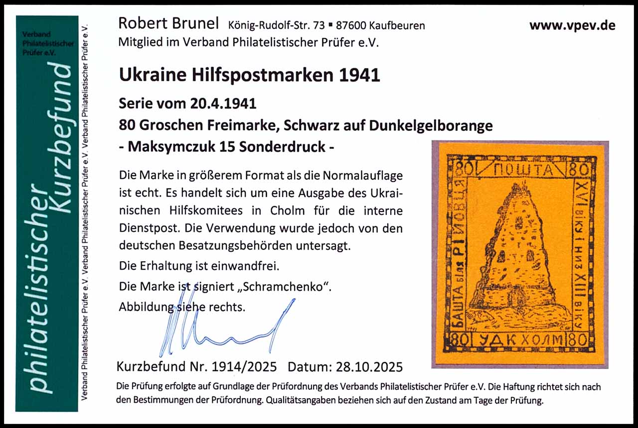 Hilfspost Ukraine Cholm Ausgabe 20.4.1941, 80 Groschen schwarz auf dunkelgelborange ungummiertem, gestrichenem Kunstdruckpapier, Ausgabe des Ukrainischen Hilfskomitees in Cholm für die interne Dienstpost - dessen Verwendung aber von den deutschen Besatzungsbehörden untersagt wurde, ungebraucht - wie verausgabt, tadellos, geprüft Shramchenko, Fotobefund Robert Brunel VP (2025) "einwandfrei", selten angeboten!
