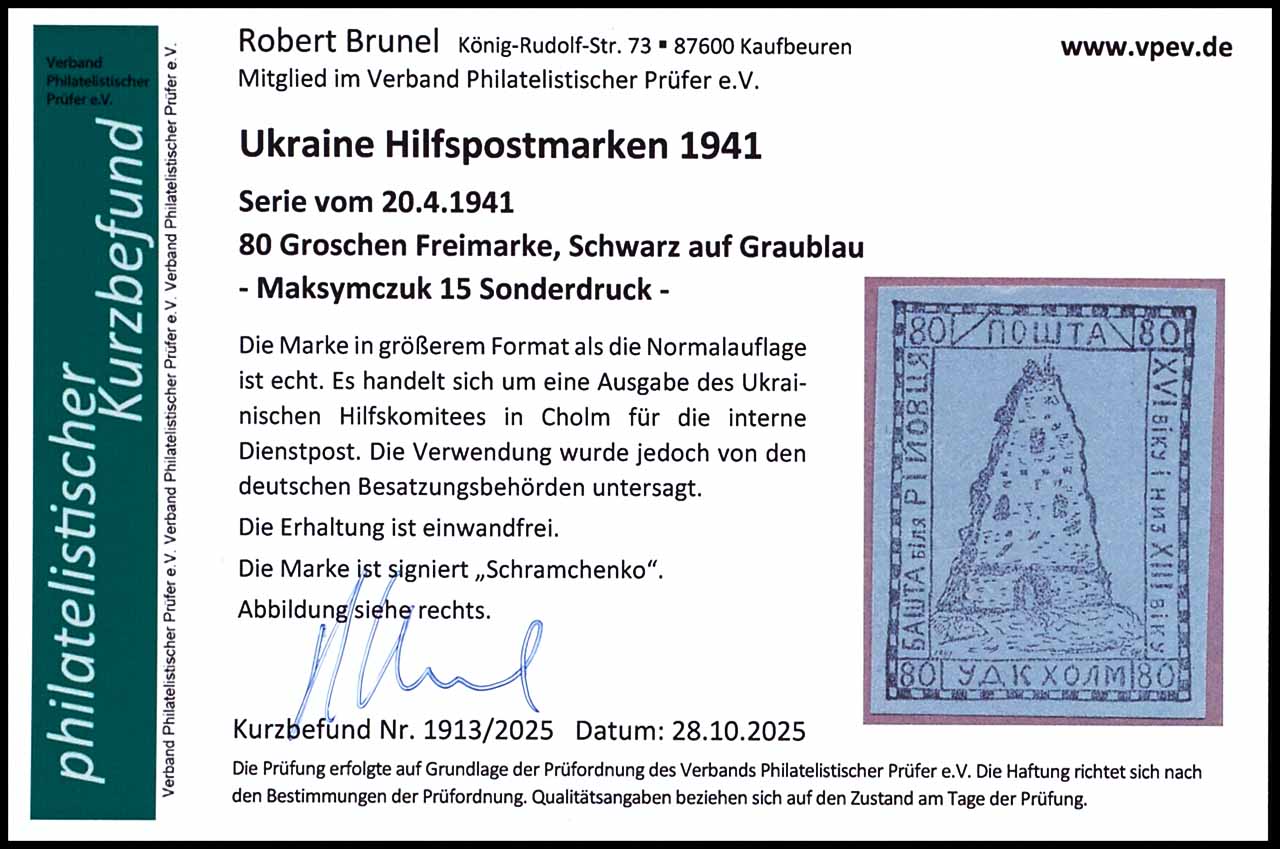 Hilfspost Ukraine Cholm Ausgabe 20.4.1941, 80 Groschen schwarz auf graublau ungummiertem, gestrichenem Kunstdruckpapier, Ausgabe des Ukrainischen Hilfskomitees in Cholm für die interne Dienstpost - dessen Verwendung aber von den deutschen Besatzungsbehörden untersagt wurde, ungebraucht - wie verausgabt, tadellos, geprüft Shramchenko, Fotobefund Robert Brunel VP (2025) "einwandfrei", selten angeboten!