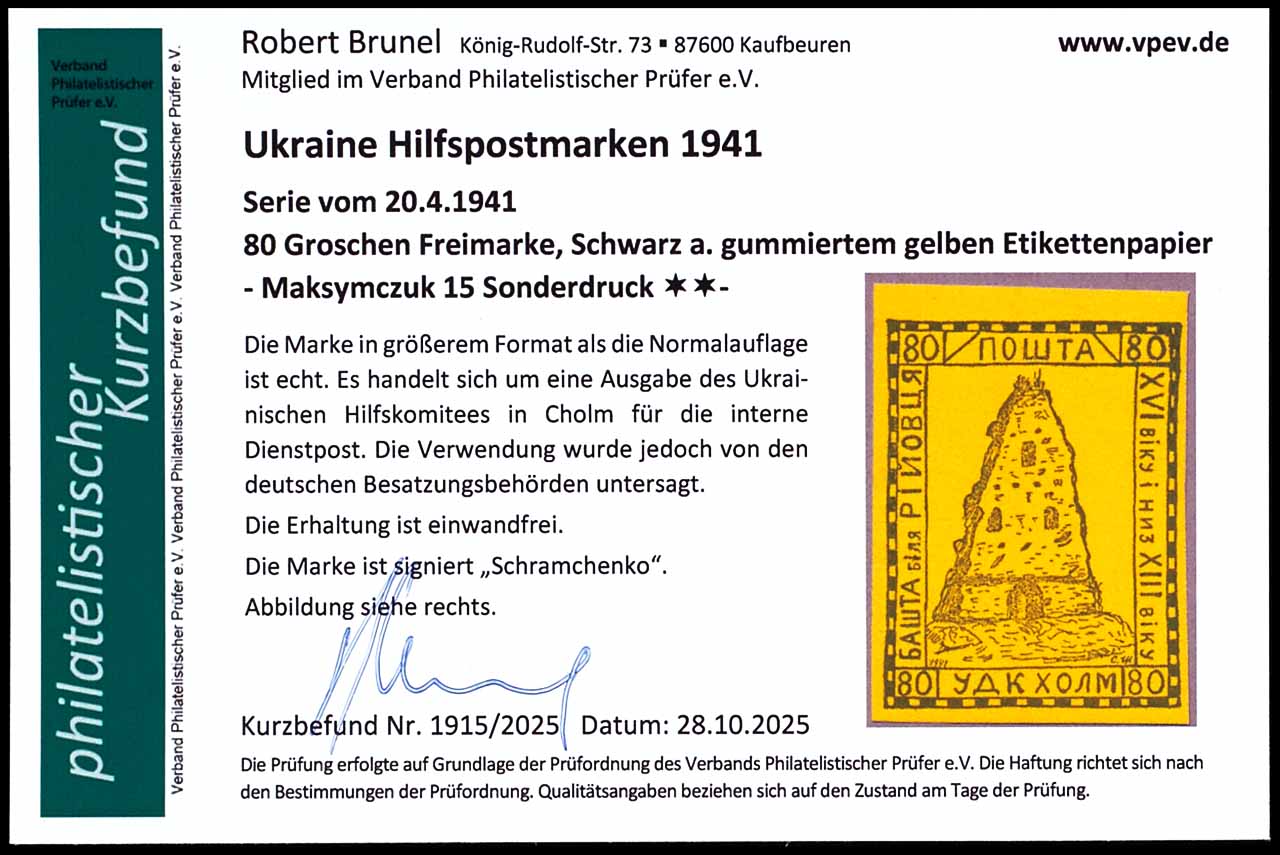 Hilfspost Ukraine Cholm Ausgabe 20.4.1941, 80 Groschen schwarz auf gummiertem gelben Ettikettenpapier, Ausgabe des Ukrainischen Hilfskomitees in Cholm für die interne Dienstpost - dessen Verwendung aber von den deutschen Besatzungsbehörden untersagt wurde, ungebraucht - wie verausgabt, tadellos, geprüft Shramchenko, Fotobefund Robert Brunel VP (2025) "einwandfrei", selten angeboten!