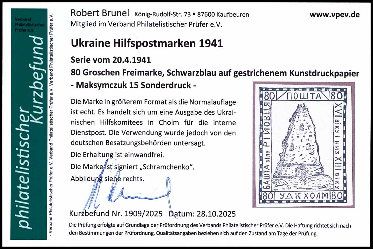 Hilfspost Ukraine Cholm Ausgabe 20.4.1941, 80 Groschen schwarzblau auf ungummiertem, gestrichenem Kunstdruckpapier, Ausgabe des Ukrainischen Hilfskomitees in Cholm für die interne Dienstpost - dessen Verwendung aber von den deutschen Besatzungsbehörden untersagt wurde, ungebraucht - wie verausgabt, tadellos, geprüft Shramchenko, Fotobefund Robert Brunel VP (2025) "einwandfrei", selten angeboten!