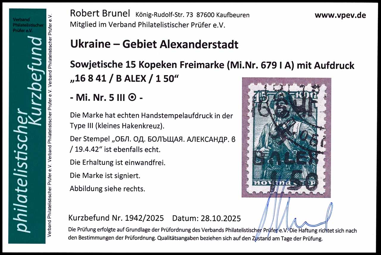 15 Kopeken mit Handstempel-Aufdruck "16.8.41/B.ALEX/1.50", entwertet mit Stempel "Obl. OD. BOLSCHAJA. ALEXANDR. 6 19.4.42", Fotobefund Robert Brunel VP (2025) "Die Erhaltung ist einwandfrei", Mi. 220.-