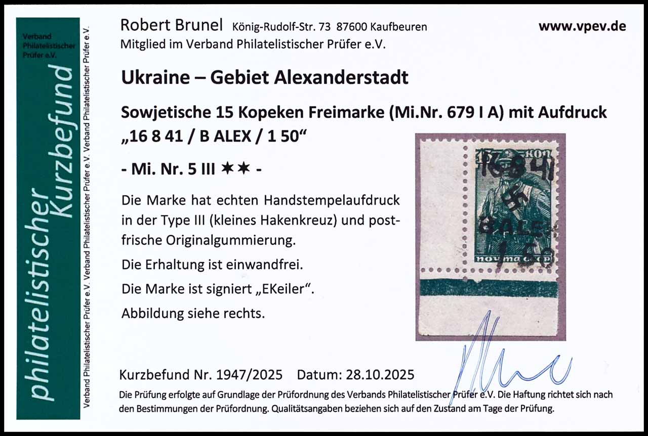 15 Kopeken mit Handstempel-Aufdruck "16.8.41/B.ALEX/1.50", vom Unterrand, postfrisch mit Originalgummierung, tadellos, geprüft E Keiler, Fotobefund Robert Brunel VP (2025) "Die Erhaltung ist einwandfrei" Mi. 100.-