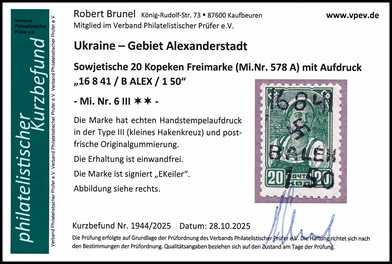 20 Kopeken mit Handstempel-Aufdruck "16.8.41/B.ALEX/1.50", ungebraucht mit Originalgummierung, tadellos, geprüft E Keiler, Fotobefund Robert Brunel VP (2025) "Die Erhaltung ist einwandfrei"
