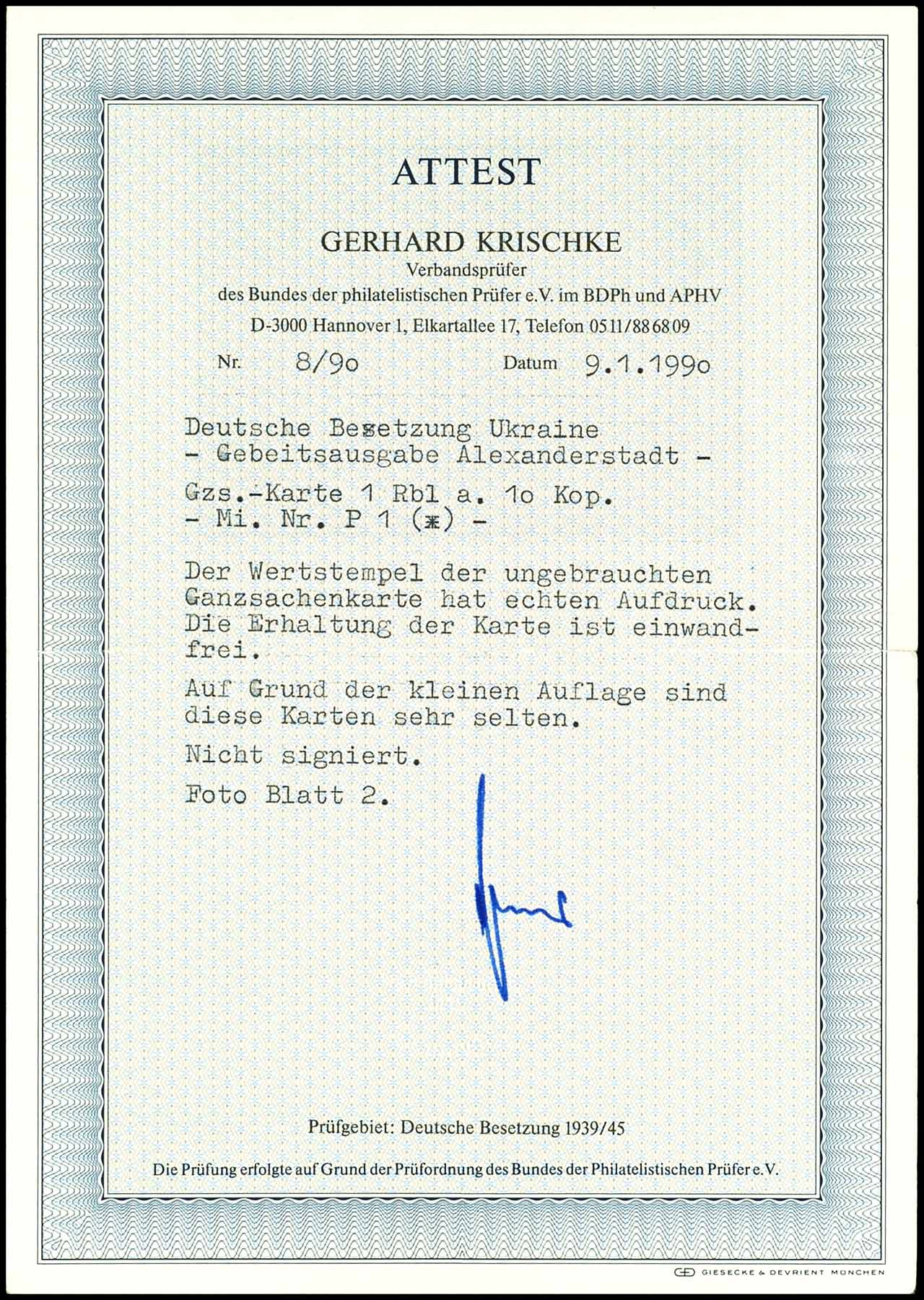 1 Rbl. auf 10 Kop. Ganzsachenkarte, der Wertstempel der ungebrauchten Ganzsachenkarte ist echt, unsigniert und Fotoattest Gerhard Krischke BPP "Die Erhaltung der Karte ist einwandfrei. Auf Grund der kleinen Auflage sind diese Karten sehr selten.", Mi. 1200.-