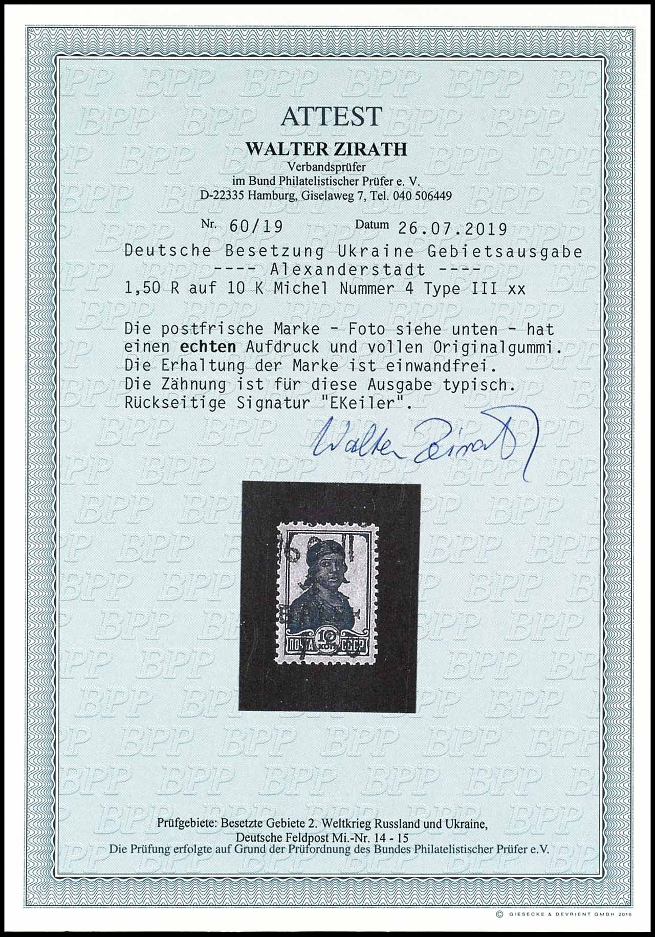 1,50 Rbl. auf 10 Kopeken Freimarke, Aufdruck in Type III, einwandfrei postfrisch, aufgrund der geringen Auflage seltene Marke, signiert EKeiler und Expertise Walter Zirath BPP "Die Erhaltung ist einwandfrei.", Mi. 1.300.-