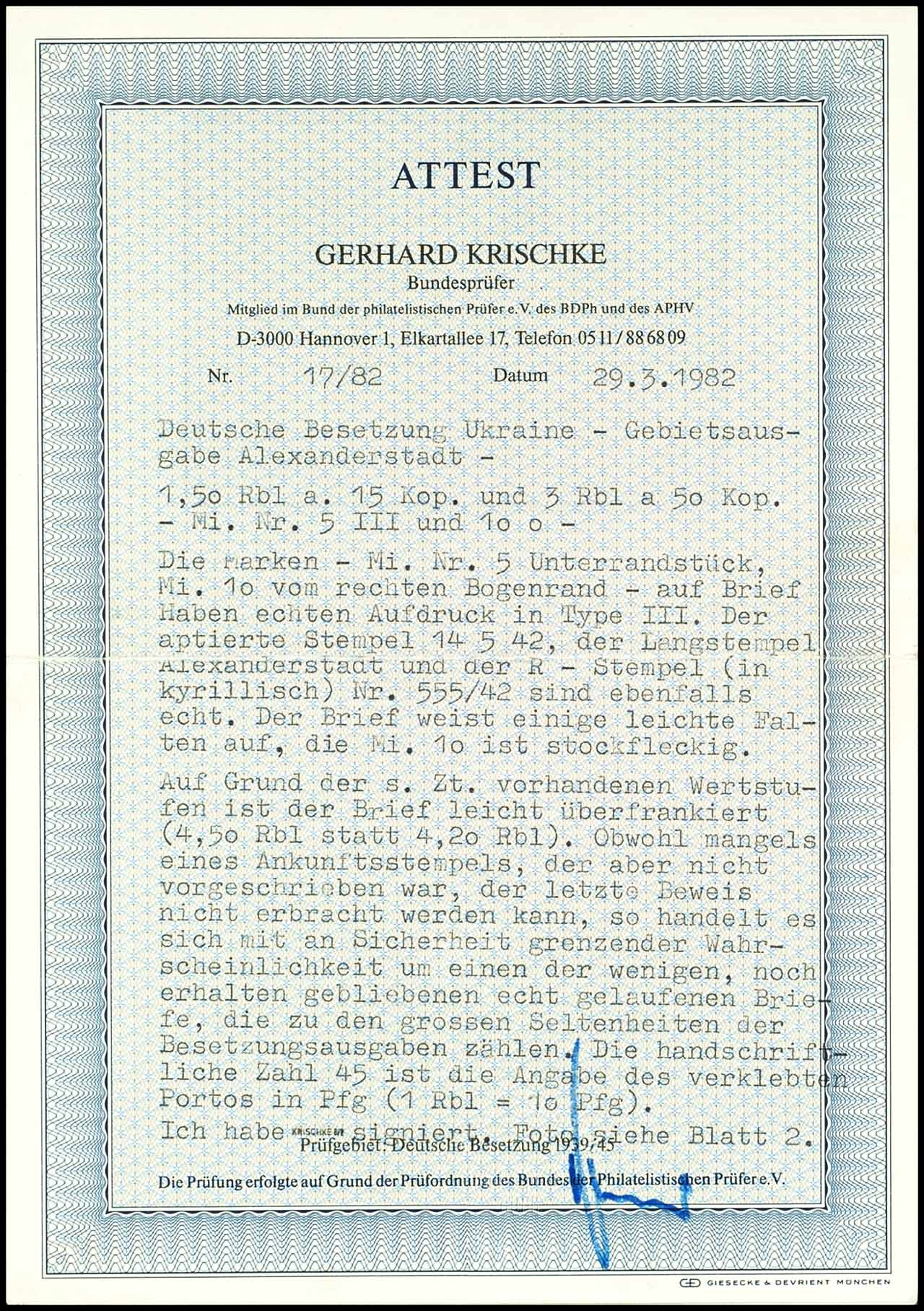 1,50 Rbl. auf 15 Kopeken und 3 Rbl. auf 50 Kopeken Freimarken, Aufdrucke in Type III auf Brief (Bedarfserhaltung), Randstücke, Mi.-Nr.10 stockfleckig, auf wahrscheinlich postalisch nicht befördertem leicht überfrankiertem Einschreiben mit Entwertung durch stummen Stempel "14 5 42" und Einzeiler "Alexanderstadt, signiert EKeiler et alia und Fotoattest Gerhard Krischke "... Obwohl mangels eines Ankunftsstempels, der aber nicht vorgeschrieben war, der letzte Beweis nicht erbracht werden kann, so handelt es sich mit an Sicherheit grenzender Wahrscheinlichkeit um einen der wenigen, noch erhalten gebliebenen echt gelaufenen Briefe", Mi. 570.- (für lose Marken)