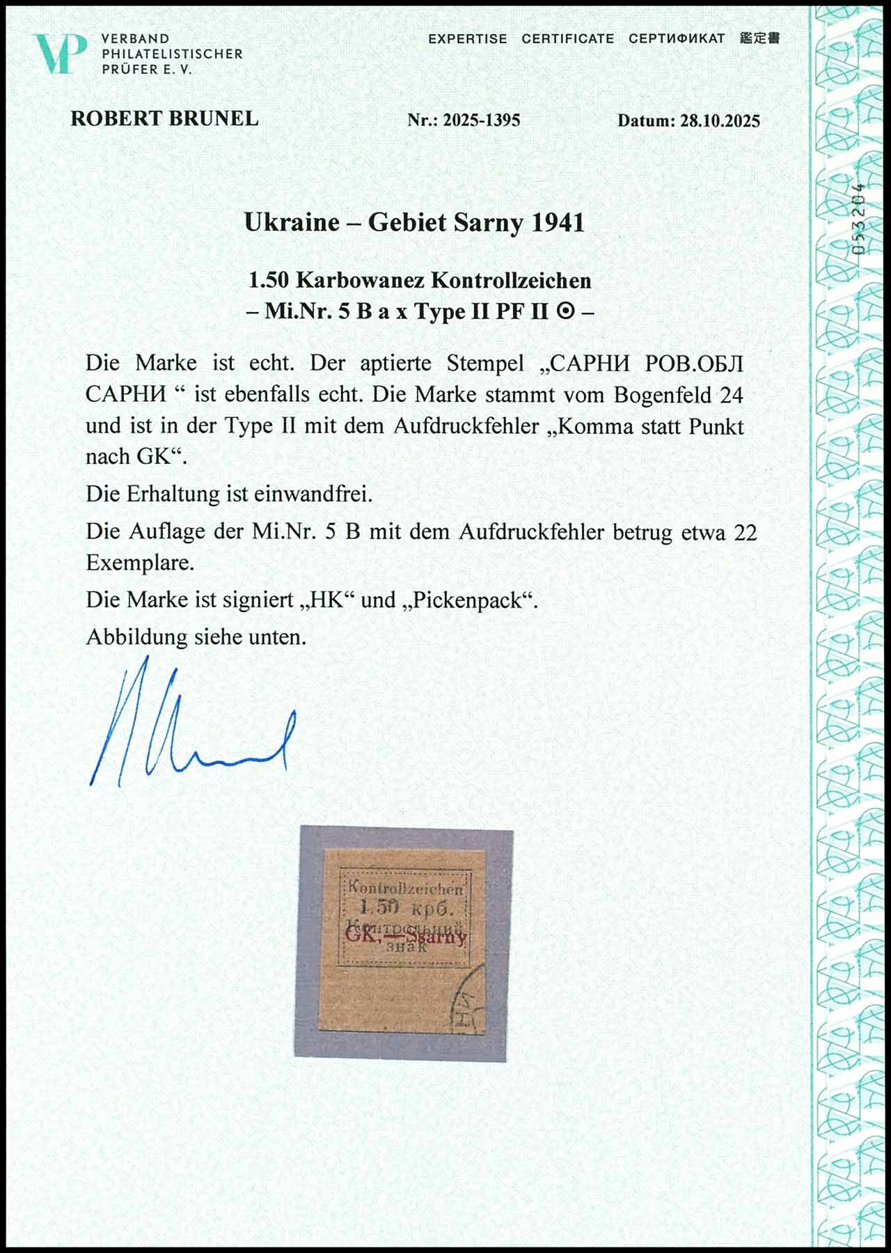 1,50 Karbowanez Kontrollzeichen mit dunkellilarotem Buchdruck-Aufdruck "GK.Ssarny" Type II, Bogenfeld 24, entwertet mit Stempel "CARNY POB. OBL. CARNY", tadellos, Gesamtauflage der Mi.Nr. 5Bax mit dem Aufdruckfehler "Komma statt Punkt nach GK": 22 Exemplare, geprüft HK und Pickenpack, Expertise Robert Brunel VP (2025), Mi. 300.-+