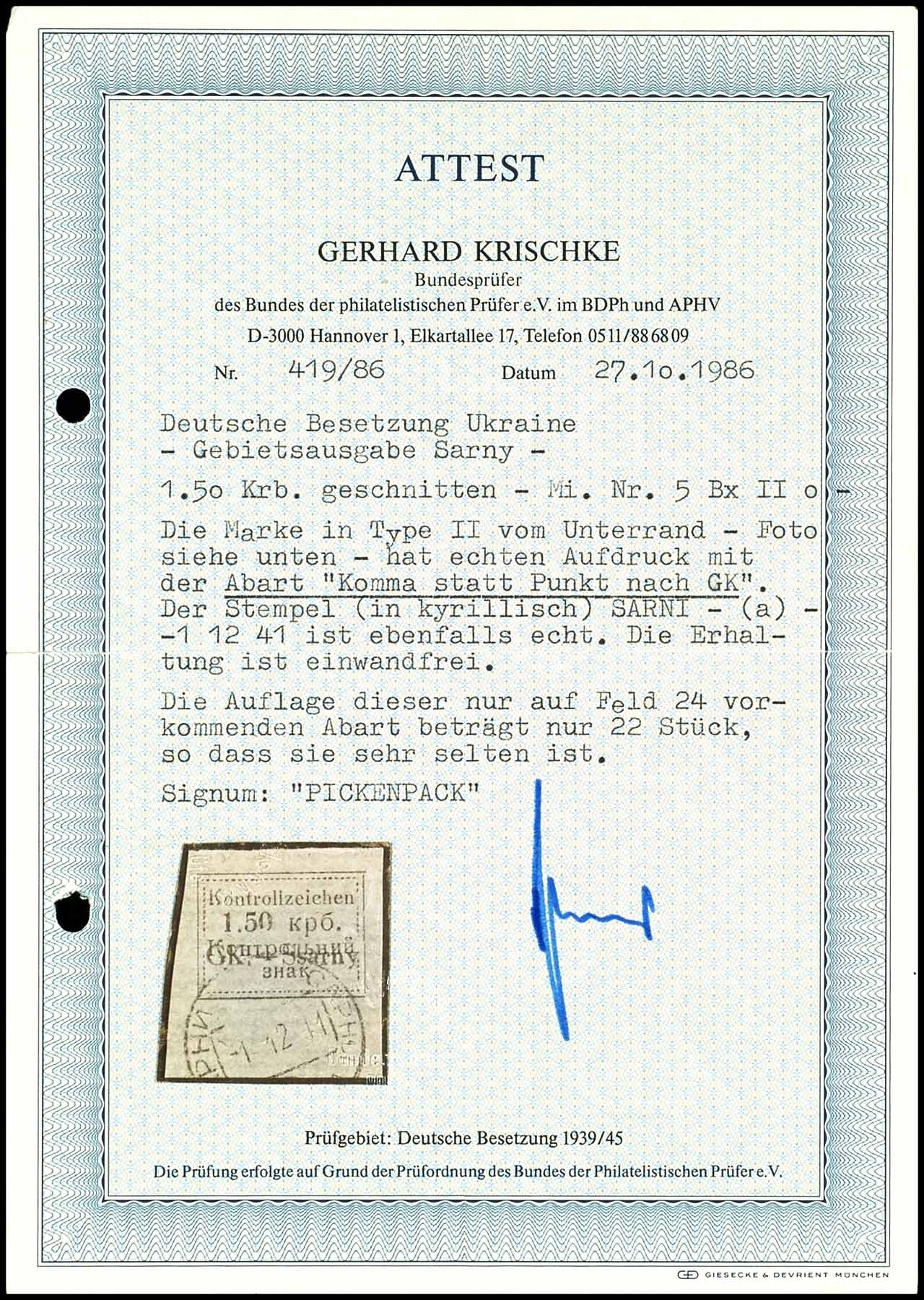 1,50 Karbowanez mit rotem Bdr.-Aufdruck "GK.-Sarny", Type II, vom Unterrand, mit echtem kyrillischem Stempel SARNY-(a)- 1 12 41, mit Plattenfehler II "Komma statt Punkt nach GK.", signiert Pickenpack und Fotoattest Gerhard Krischke BPP (1986):" Die Erhaltung ist einwandfrei. Die Auflage dieser nur auf Feld 24 vorkommenden Abart beträgt nur 22Stück, so dass sie sehr selten ist.", Mi. 600.-