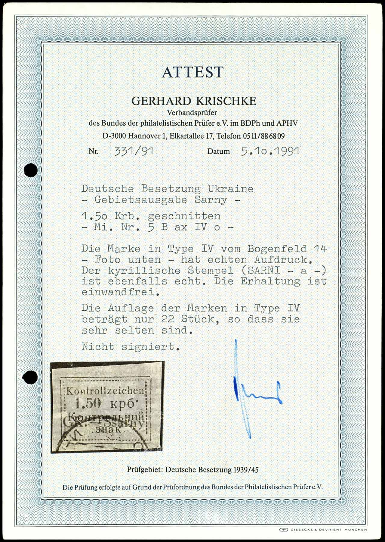 1,50 Karbowanez mit rotem Bdr.-Aufdruck "GK.-Sarny", Type IV (Feld 14), mit echtem kyrillischem Stempel SARNY-a- ..., unsigniert und Fotoattest Gerhard Krischke BPP (1991):" Die Erhaltung ist einwandfrei. Die Auflage der Marken in Type IV beträgt nur 22 Stück, so dass sie sehr selten sind.", Mi. 400.-