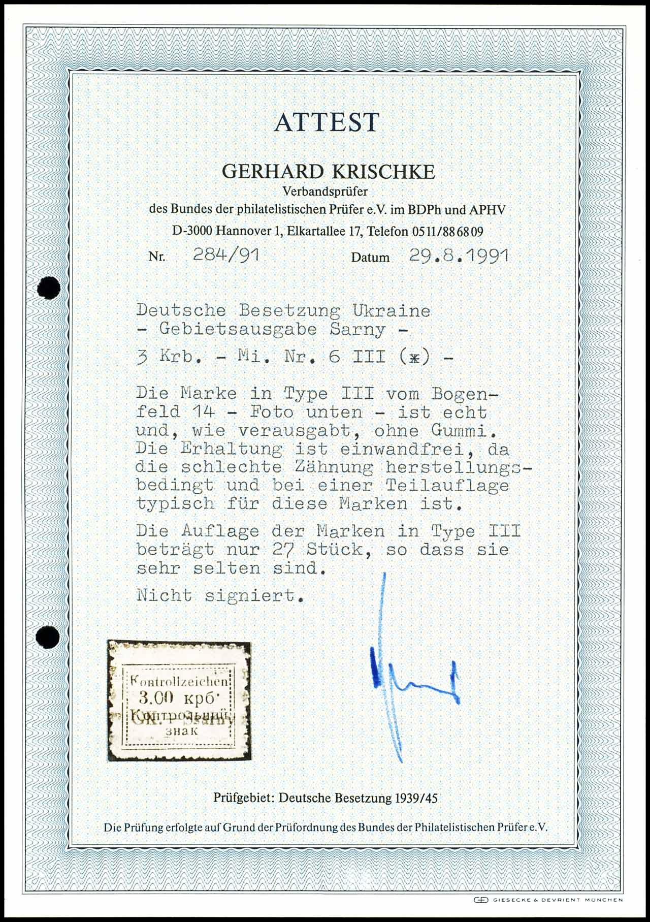3 Karbowanez mit Aufdruck "GK.-Ssarny", Bogenfeld 14 Type III, ungebraucht ohne Gummierung - wie verausgabt, tadellose Erhaltung, Auflage nur 27 Exemplare, unsigniert, Fotoattest Gerhard Krischke BPP "Die Erhaltung ist einwandfrei.", Mi. 700.-