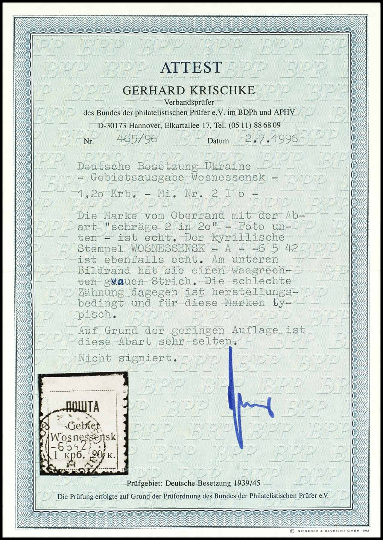 1,20 Krb. Freimarke, entwertet "WOSNESSENSK -A- 6 5 42", ausgabetypische Zähnung, am unteren Markenrand ein grauer Strich, mit Plattenfehler I ("2" von "20 K." schräg), unsigniert, Fotoattest Gerhard Krischke BPP " ...Auf Grund der geringen Auflage ist diese Abart sehr selten.", Mi. 600.-
