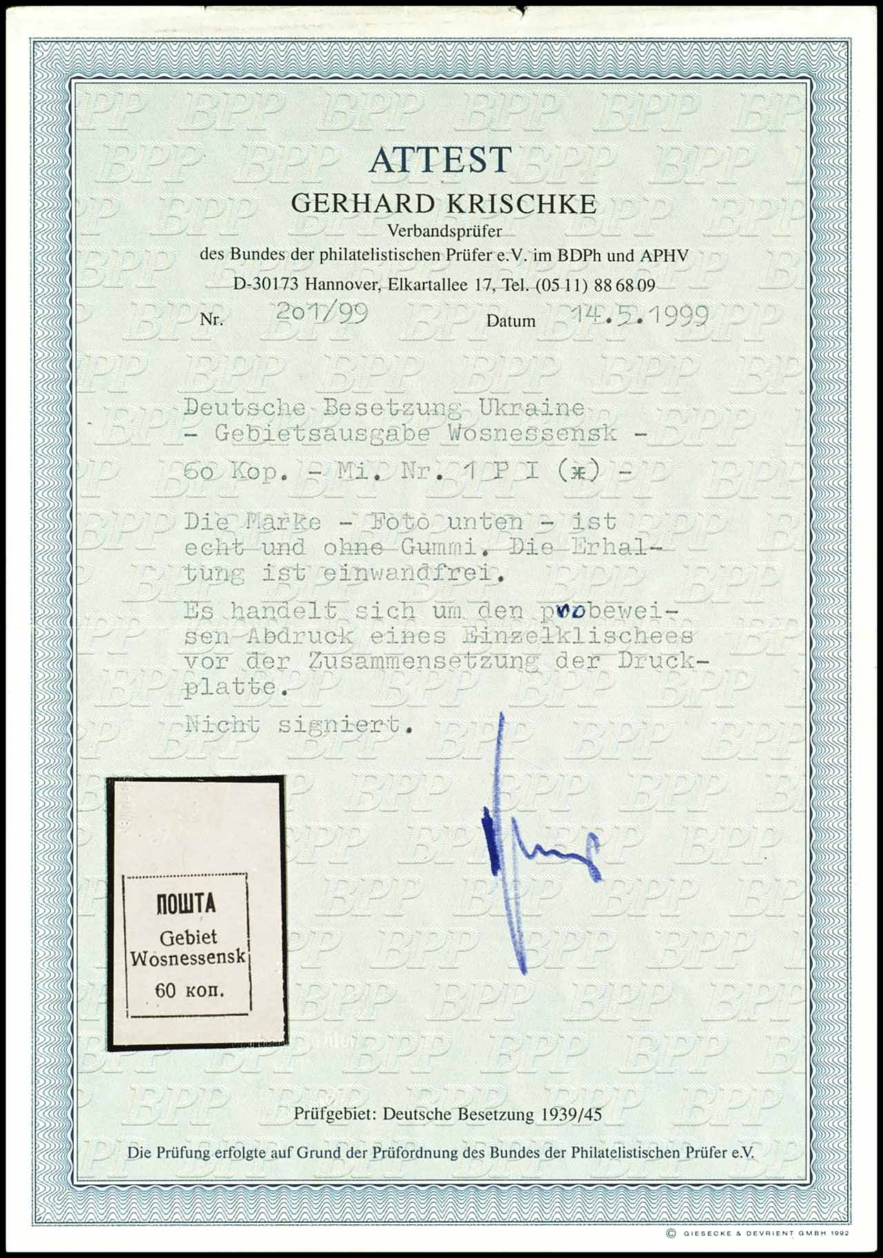 60 Kopeken schwarz, probeweiser Abdruck auf ungummiertem Papier eines Einzelklischees vor dem Zusammensetzen der Druckplatte, in einwandfreier ungebrauchter Erhaltung, unsigniert, Fotoattest Gerhard Krischke BPP:" ...Die Erhaltung ist einwandfrei...", Mi. 500.-