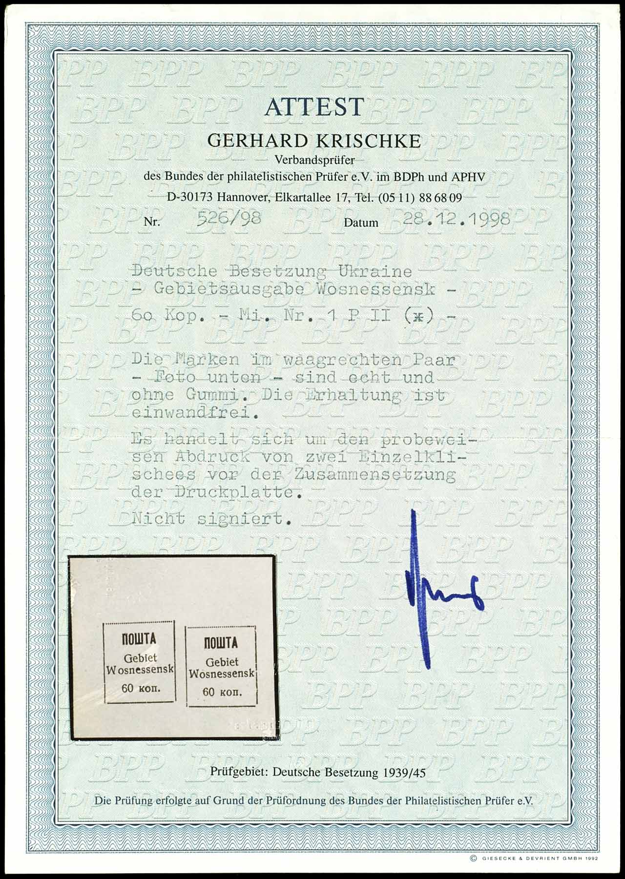 60 Kopeken schwarz, probeweiser Abzug auf ungummiertem Papier von zwei Einzelklischees als waagerechtes Paar vor dem Zusammensetzen der Druckplatte, in einwandfreier ungebrauchter Erhaltung, unsigniert, Fotoattest Gerhard Krischke BPP "Die Erhaltung ist einwandfrei."