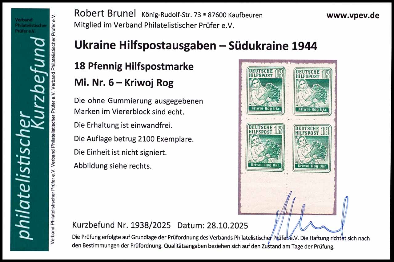 Kriwoj Rog, 18 Pfennig Hilfspostmarke, Bäuerin mit Getreidegarbe, schwärzlichgelbsmaragdgrün, Viererblock vom Unterrand, ungebraucht ohne Gummierung - wie verausgabt, tadellos, Fotobefund Robert Brunel VP (2025) "Die Erhaltung ist einwandfrei", Auflage 2100 Stück