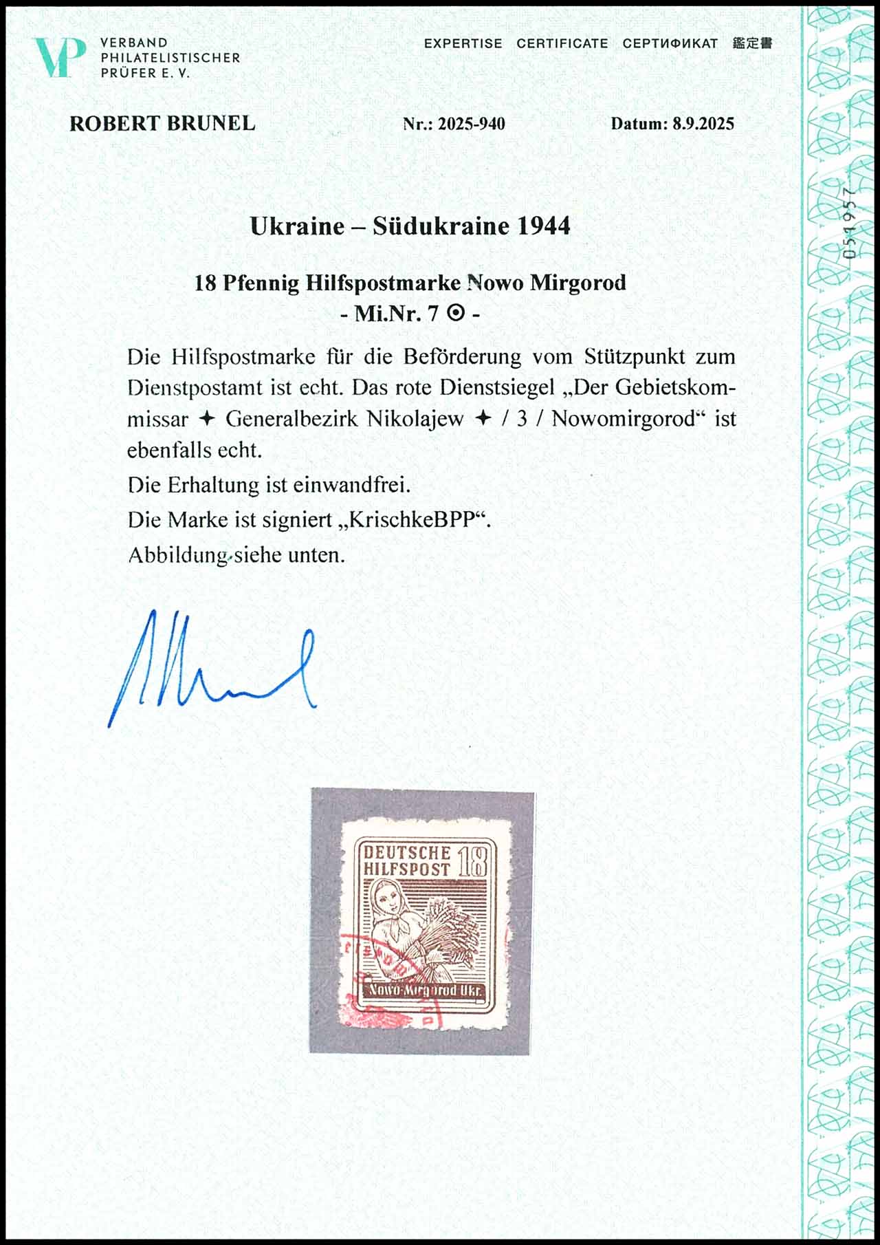 18 Pfennig braun, Hilfspostmarke, tadellos entwertet mit roter Dienstsiegel-Entwertung des Gebietskommissars "Generalbezirk Nikolajew * Nowo Mirgorod - 3 -", tadellose Zähnung, geprüft Krischke BPP, Expertise Robert Brunel VP (2025) "Die Erhaltung ist einwandfrei.", Mi. 1.000.-