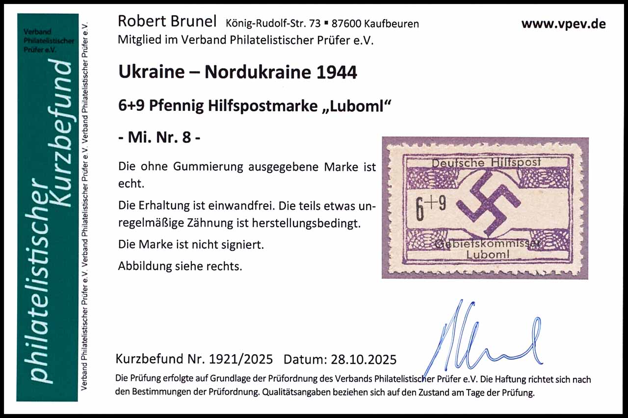 Luboml, 6+9 Pfennig Hilfspostmarke, ungebraucht - ungummiert, wie verausgabt, tadellos, Fotobefund Robert Brunel VP (2025) ", Mi. 150.-