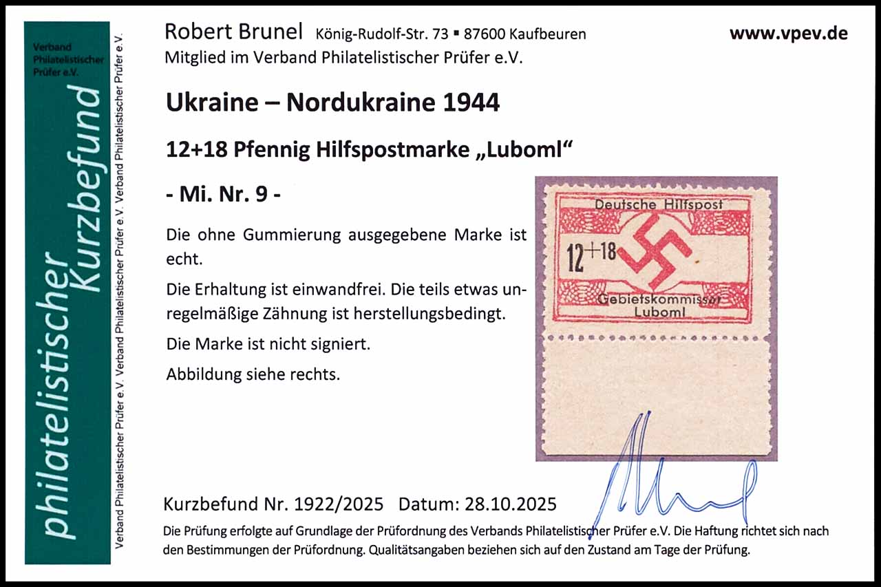 Luboml, 12+18 Pfennig Hilfspostmarke vom Unterrand, ungebraucht - ungummiert, wie verausgabt, tadellos, unsigniert, Fotobefund Robert Brunel VP (2025) ", Mi. 150.-