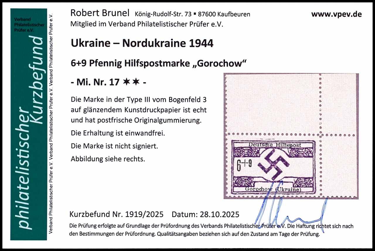 6+9 Pfennig Hilfspostmarke, Bogenfeld 3, Type III, postfrisch, tadellos, Fotobefund Robert Brunel VP (2025) ", Mi. 230.-