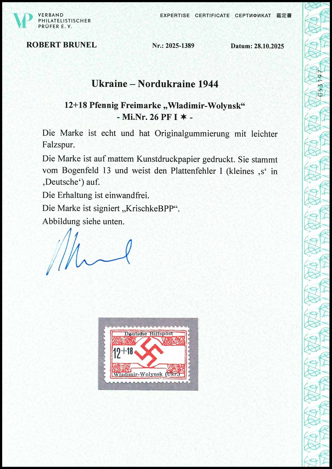 12+18 Pfennig Wladimir-Wolynsk, ungebrauchte Originalgummierung mit leichter Falzspur, Bogenfeld 13, mit Plattefehler I: "kleines s in Deutsche", tadellos, geprüft Krischke BPP, Expertise Robert Brunel VP (2025), "Die Erhaltung ist einwandfrei", Mi. 240.-