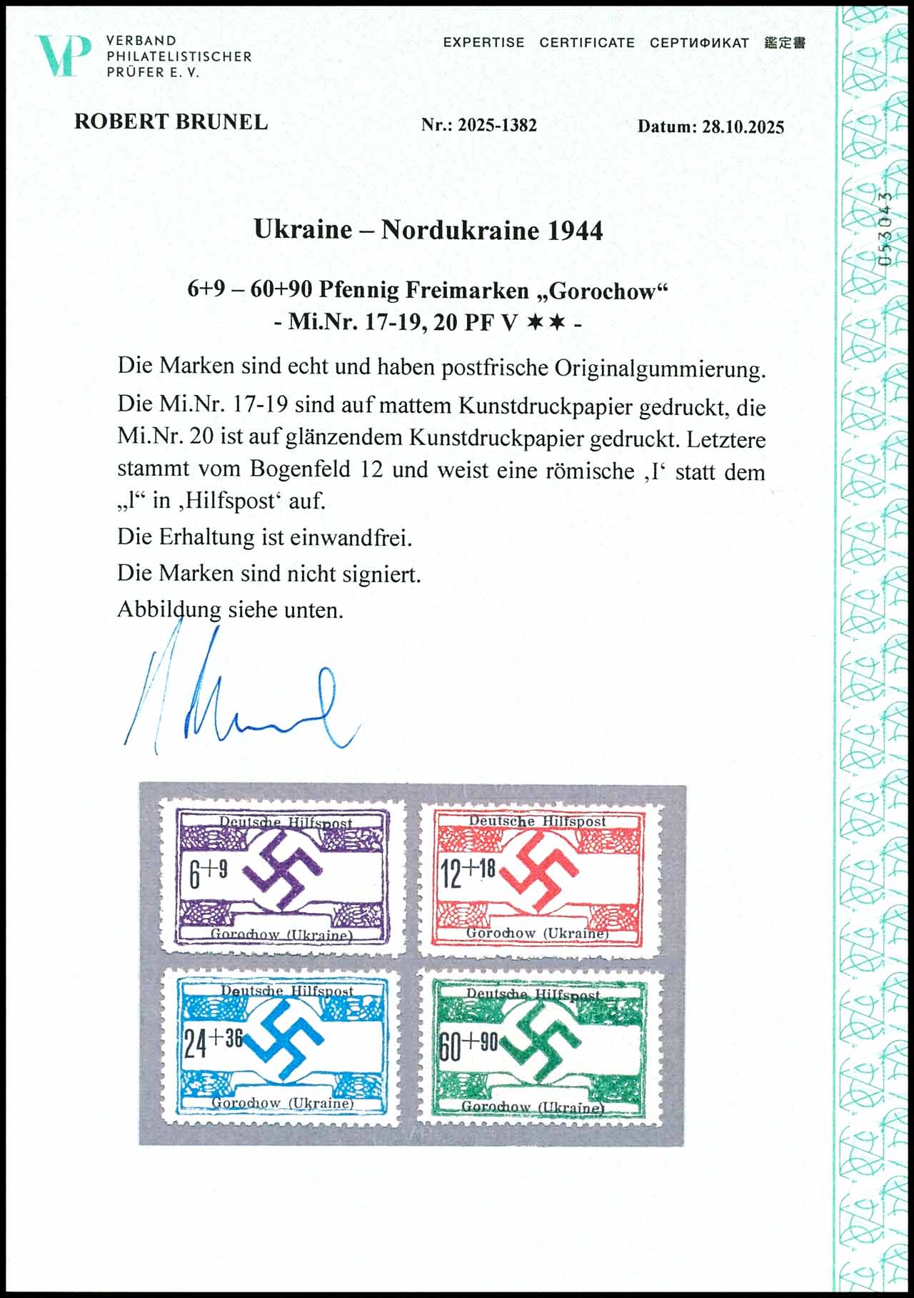 6+9 bis 60+90 Pfennig, MiNr. 17-19 auf mattem Kunstdruckpapier, MiNr. 20 auf glänzendem Kunstdruckpapier gedruckt, MiNr. 20 mit Plattenfehler V: " römisches "I" statt kleinem "l" in Hilfspost, Bogenfeld 12", postfrische Originalgummierung, tadellos, unsigniert, Expertise Robert Brunel VP (2025), "Die Erhaltung ist einwandfrei", Mi. 1.100.-+