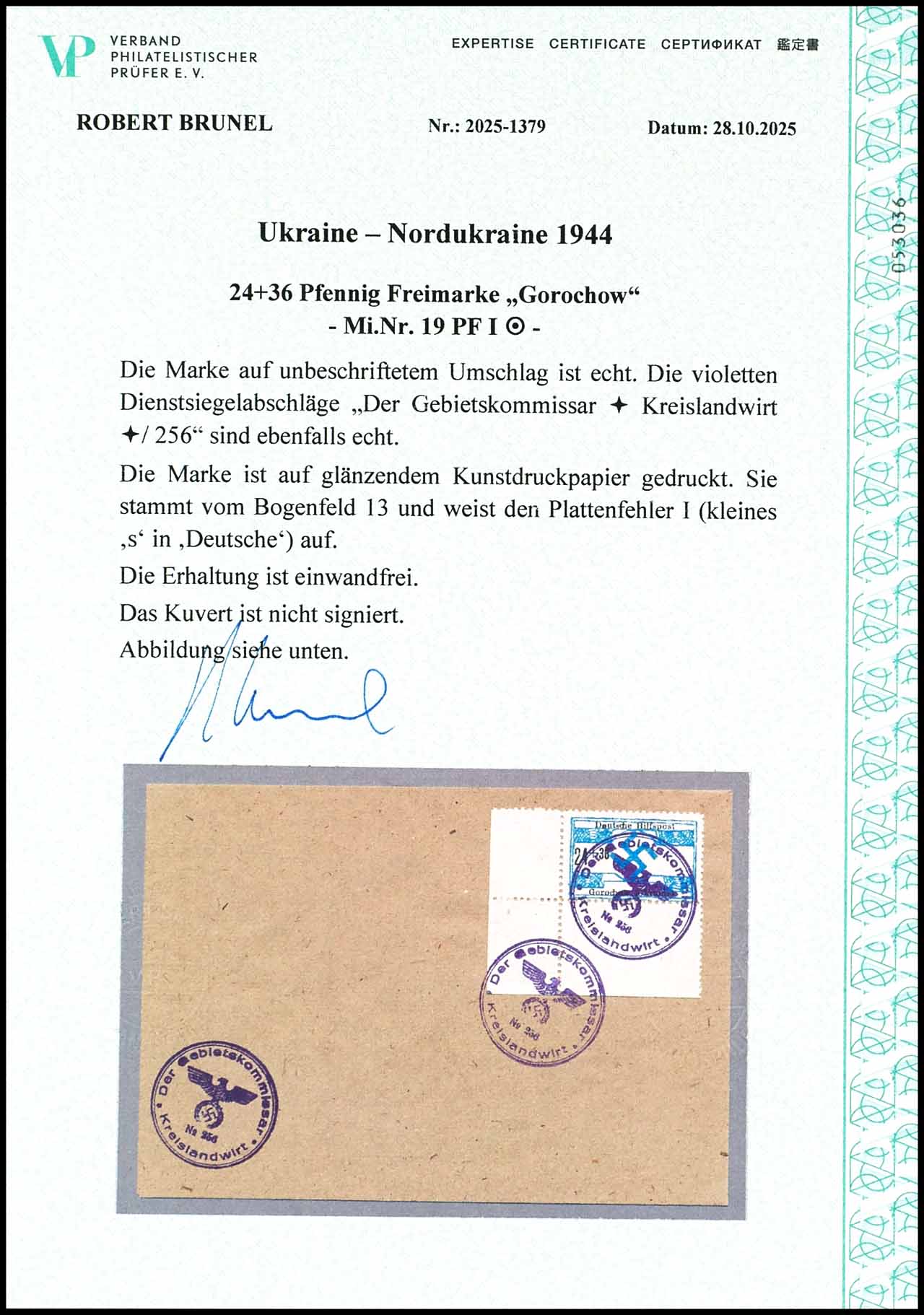 24+36 Pfennig Marke aus der linken unteren Bogenecke, Bogenfeld 13, mit Plattenfehler I "kleines s in Deutsche", entwertet mit Dienstsiegelabschlägen "Der Gebietskommissar * Kreislandwirt * 256" auf nicht adressiertem Umschlag, tadellose Erhaltung, unsigniert, Expertise Robert Brunel VP (2025), Mi. 500.-+