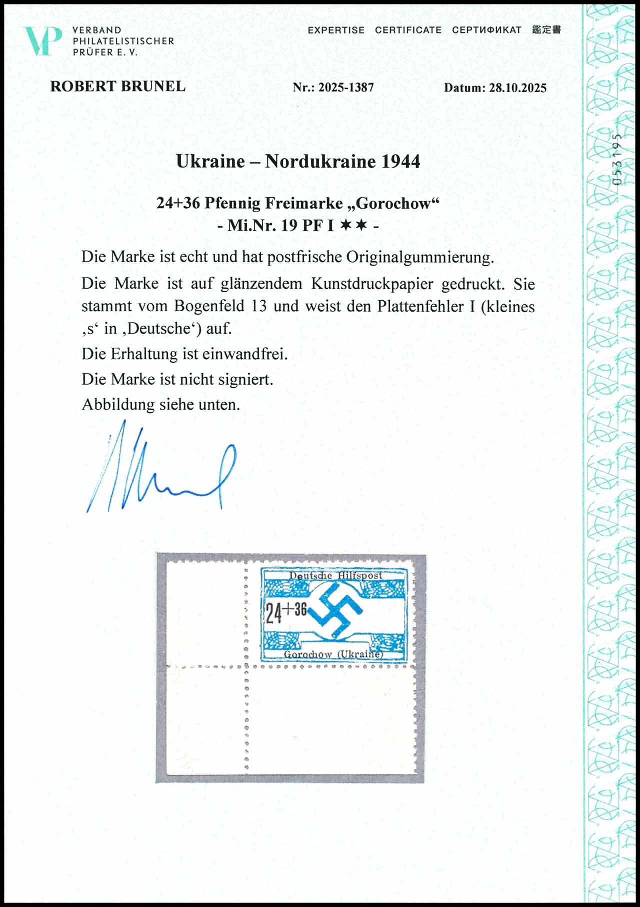 24+36 Pfennig, auf glänzendem Kunstdruckpapier gedruckt, Bogenfeld 13 mit Plattenfehler I "kleines S in Deutsches", postfrisch, tadellose Erhaltung, unsigniert, Expertise Robert Brunel VP (2025) "Die Erhaltung ist einwandfrei", Mi. 450.-