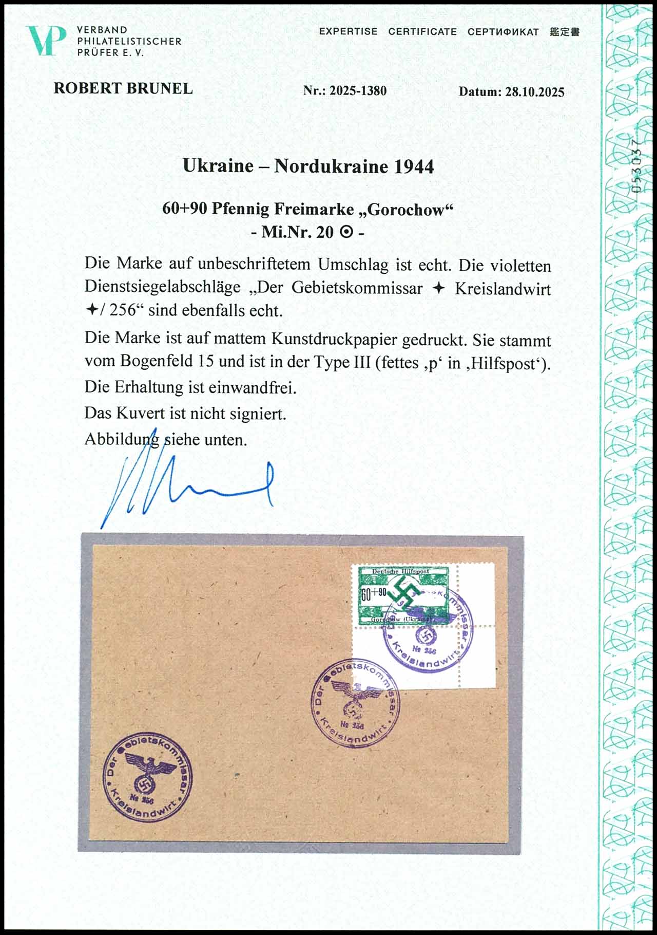 60+90 Pfennig Marke aus der rechten unteren Bogenecke, Bogenfeld 15, Type III entwertet mit Dienstsiegelabschlägen "Der Gebietskommissar * Kreislandwirt * 256" auf nicht adressiertem Umschlag, tadellose Erhaltung, unsigniert, Expertise Robert Brunel VP (2025), Mi. 500.-+
