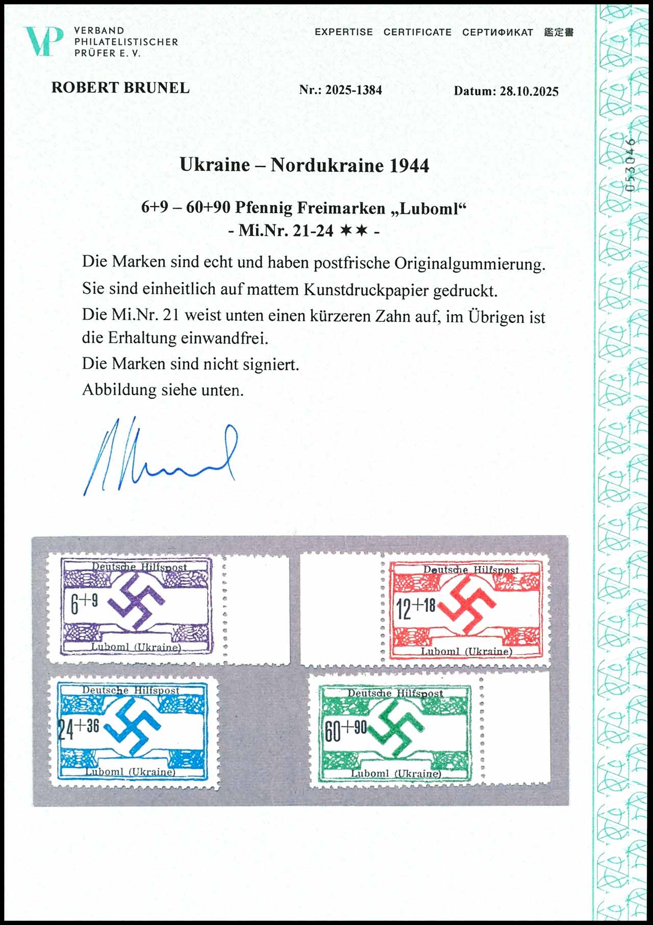 6+9 bis 60+90 Pfennig Luboml, MiNr. 21-24 auf mattem Kunstdruckpapier, postfrische Originalgummierung, tadellos, bis auf MiNr. 21 mit einem verkürzten Zahn unten, unsigniert, Expertise Robert Brunel VP (2025), Mi. 900.-