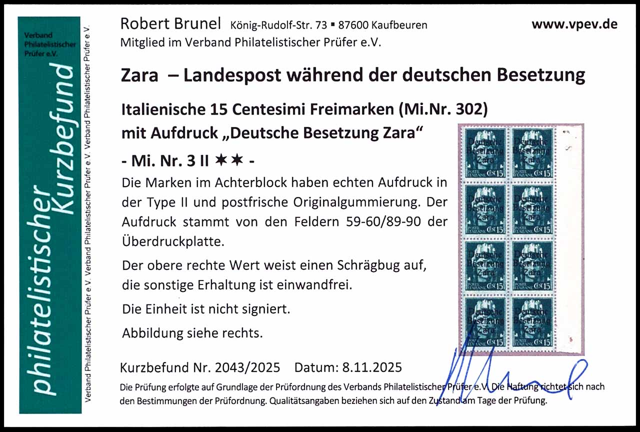 15 Centesimi mit schwarzem Buchdruck-Aufdruck "Deutsche Besetzung Zara", Type II, Block zu acht Werten, Bogenfelder 59-60 bis 89-90, oberer, rechter Wert mit Schrägbug, sehr gute Erhaltung, Fotobefund Robert Brunel VP (2025) "eine Marke mit Schrägbug, ansonsten einwandfrei", Mi. 144.-