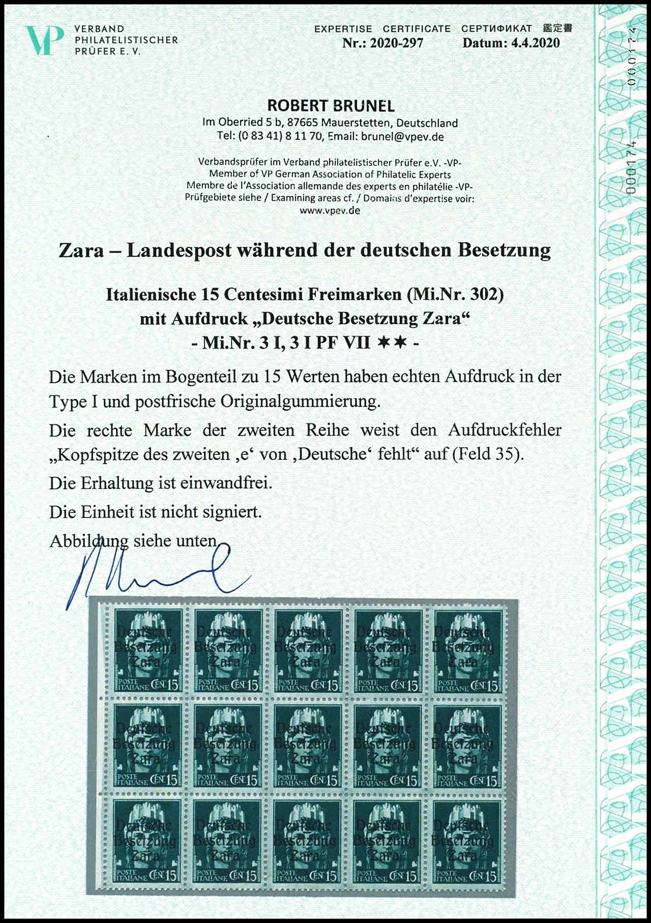 15 Centesimi mit Aufdruck "Deutsche Besetzung Zara", Bogenteil zu 15 Marken, die rechte Marke der zweiten Reihe weist den Aufdruckfehler VII: "Kopfspitze des zweiten "e" von "Deutsche" fehlt", auf, tadellose Erhaltung, Expertise Robert Brunel VP (2020), "die Erhaltung ist einwandfrei", Mi. 300.-+