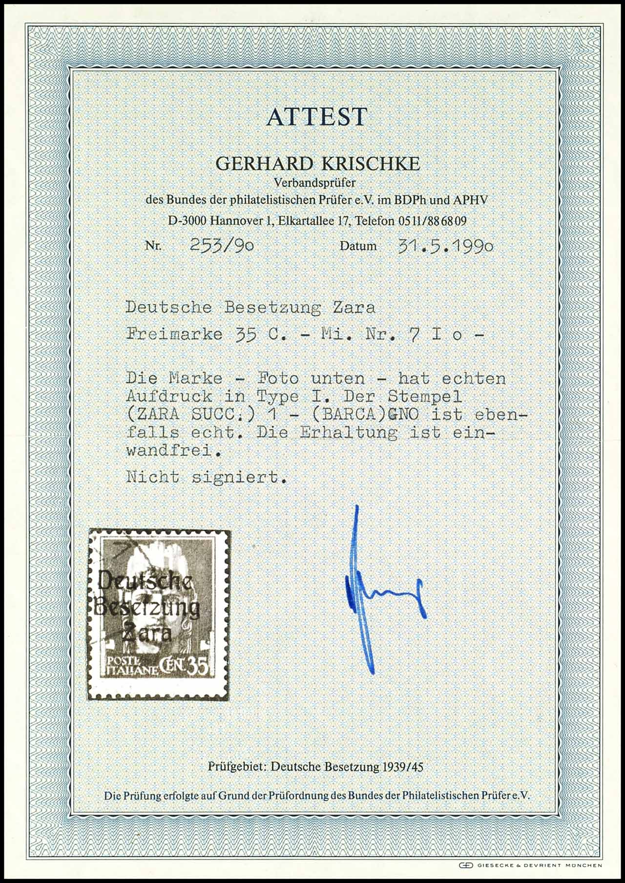 35 Centisimi mit Aufdruck "Deutsche Besetzung Zara", mit Aufdrucktype I, echte Entwertung "ZARA SUCC.) 1 - (BARCA)GNO" tadellose Erhaltung, Attest Gerhard Krischke BPP (1990), "die Erhaltung ist einwandfrei", Mi. 550.-
