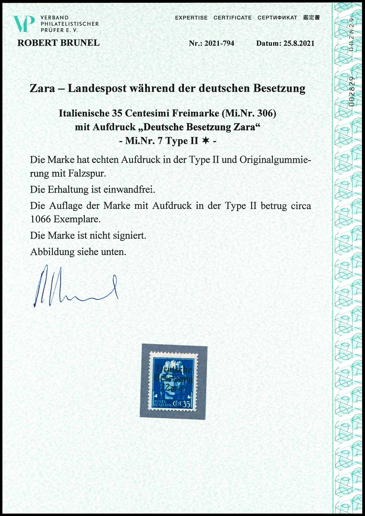 35 Centesimi mit Aufdruck "Deutsche Besetzung Zara", mit Aufdrucktype II, ungebraucht, tadellose Erhaltung, Expertise Robert Brunel (2021), "die Erhaltung ist einwandfrei", Mi. 280.-