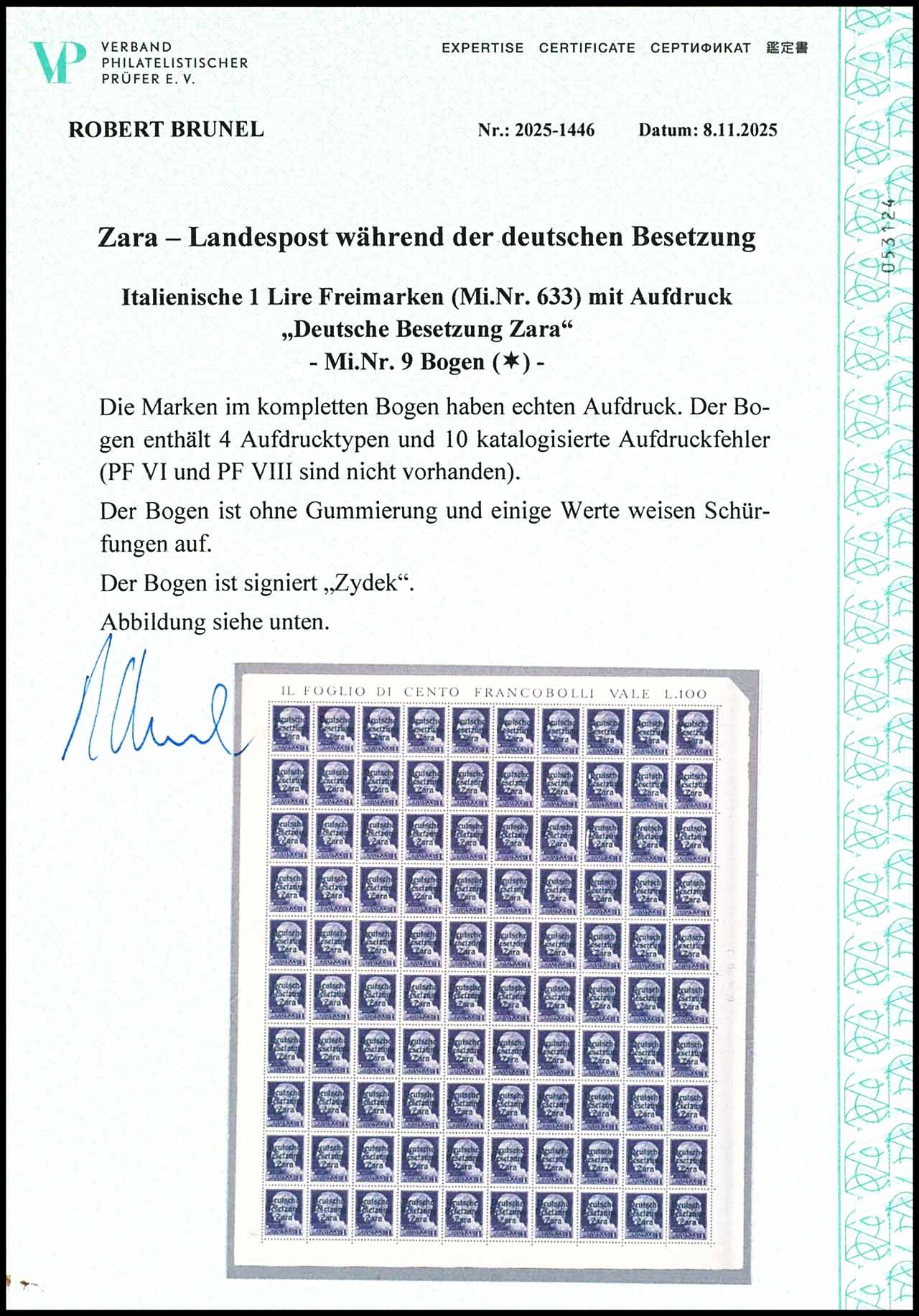 1 Lire mit schwarzem Buchdruck-Aufdruck "Deutsche Besetzung Zara", Bogen mit 100 Werten, ungebraucht, ohne Gummierung, der Bogen enthält die vier katalogisierten Aufdrucktypen und 10 katalogisierte Aufdruckfehler (die Aufdruckfehler VI und VIII sind nicht vorhanden), tadellose Erhaltung, geprüft Zydek, Expertise Robert Brunel VP (2025) "Der Bogen ist ohne Gummierung und einige Werte weisen Schürfungen auf, ohne Anrechnung der Aufdruckfehler und der Aufpreise für die besseren Typen, Mi. 500.-+