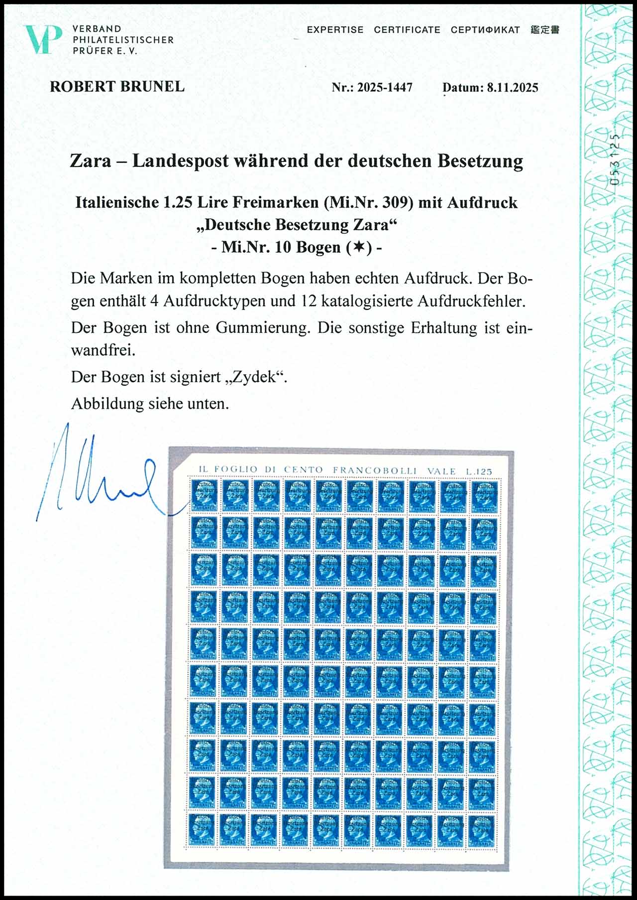 1,25 Lire mit schwarzem Buchdruck-Aufdruck "Deutsche Besetzung Zara", Bogen mit 100 Werten, ungebraucht, ohne Gummierung, der Bogen enthält die vier katalogisierten Aufdrucktypen und 12 katalogisierte Aufdruckfehler, tadellose Erhaltung, geprüft Zydek, Expertise Robert Brunel VP (2025) "Der Bogen ist ohne Gummierung. Ansonsten ist die Erhaltung einwandfrei", ohne Anrechnung der Aufdruckfehler und der Aufpreise für die besseren Typen, Mi. 450.-+