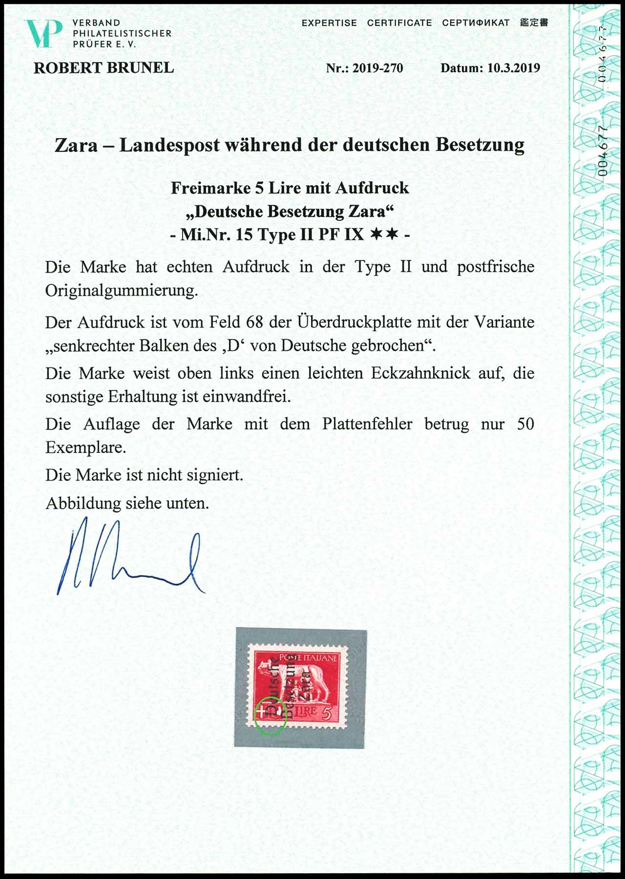 5 Lire mit Aufdruck "Deutsche Besetzung Zara", mit Aufdrucktype II, Plattenfehler IX "senkrechter Balken des D von Deutsche gebrochen", postfrisch, die Auflage mit dem Plattenfehler betrug nur 50 Exemplare, tadellose Erhaltung, bis auf einen leichten Eckzahnknick oben links, Expertise Robert Brunel VP, Mi. 950.-++